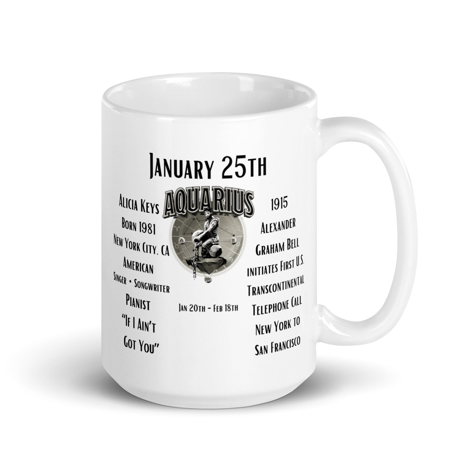 On This Day: Birthday Series - January 25th - (A) Alicia Keys & 1st U.S. Transcontinental Phone Call - White glossy mug