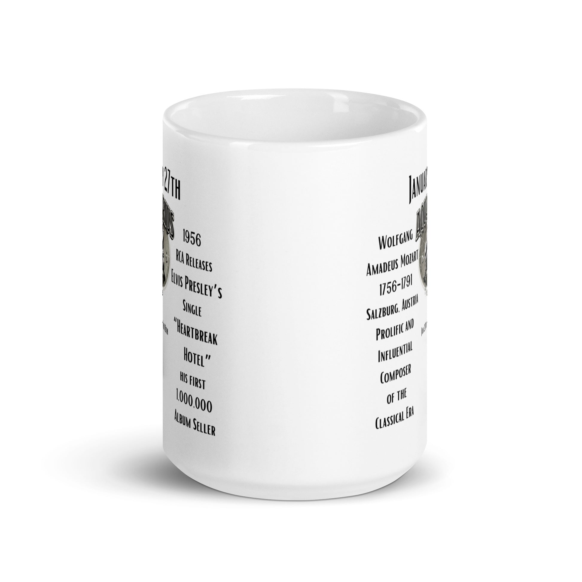 On This Day: Birthday Series - January 27th - (A) Wolfgang Amadeus Mozart & "Heartbreak Hotel" - White glossy mug
