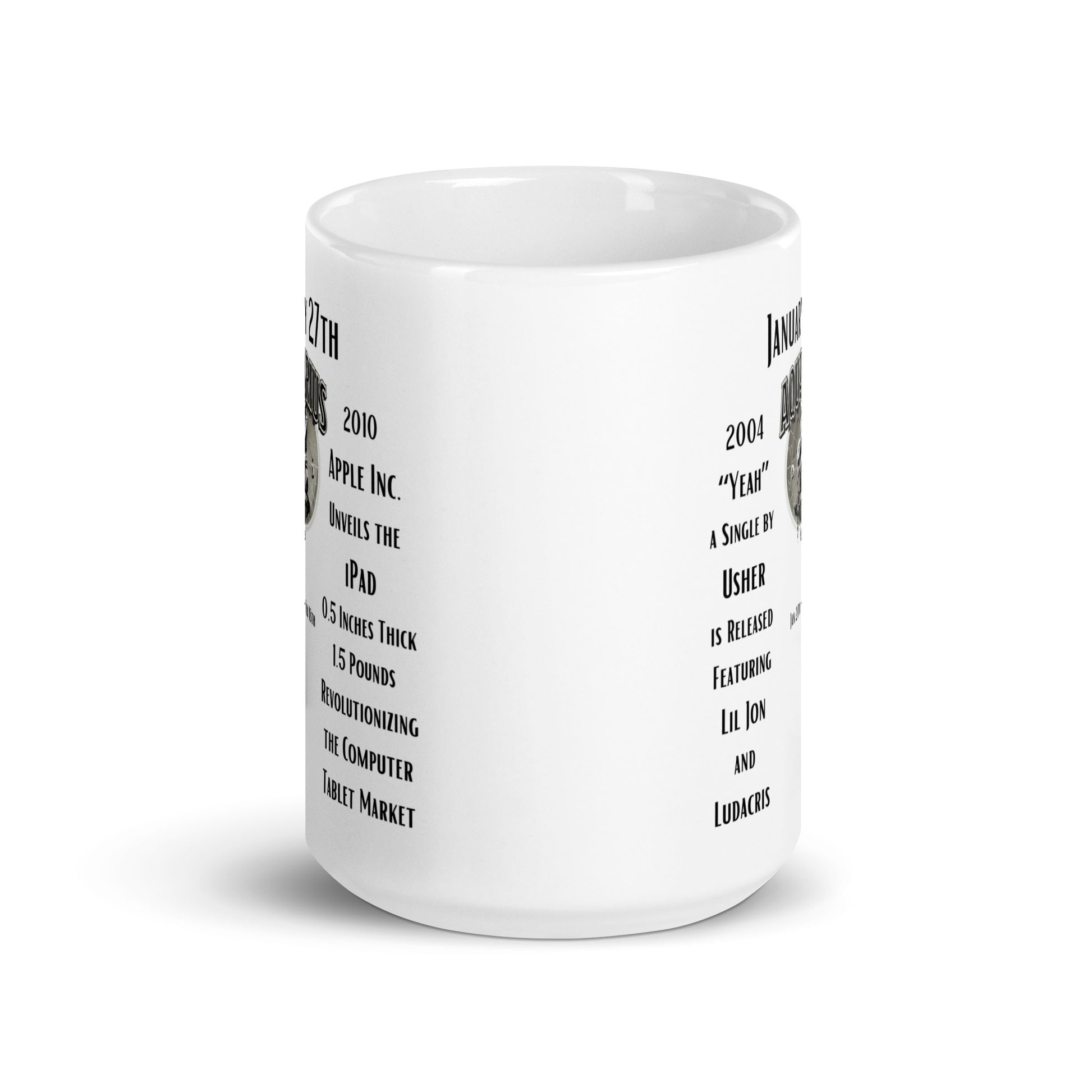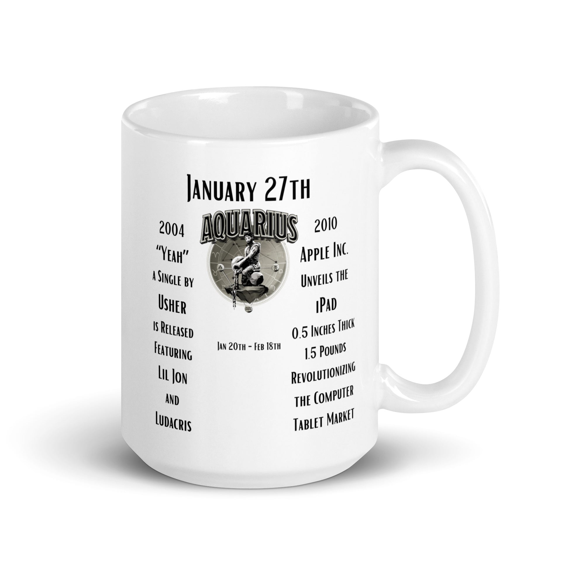 Celebrate the innovative Aquarian spirit on January 27th with this exclusive "On This Day: Birthday Series" mug! On this day, the airwaves were graced with Usher's catchy hit "Yeah!" released in 2004, marking a new era in R&B. And in 2010, technology took a giant leap forward as Apple Inc. unveiled the game-changing iPad. This mug is the perfect gift for the Aquarius in your life who appreciates the blend of music and tech innovation. Embrace the day with a sip of history!