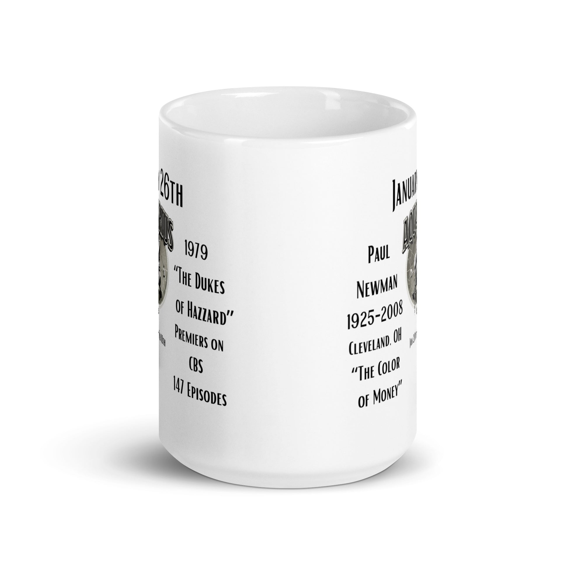 On This Day: Birthday Series - January 26th - (A) Paul Newman & "The Dukes of Hazzard" - White glossy mug