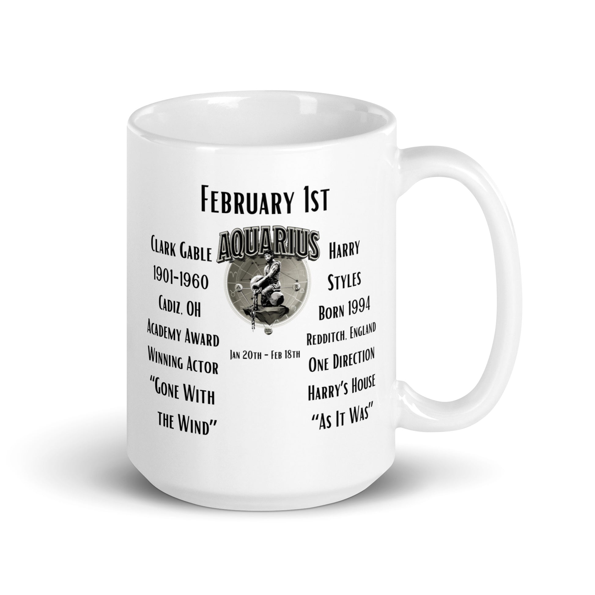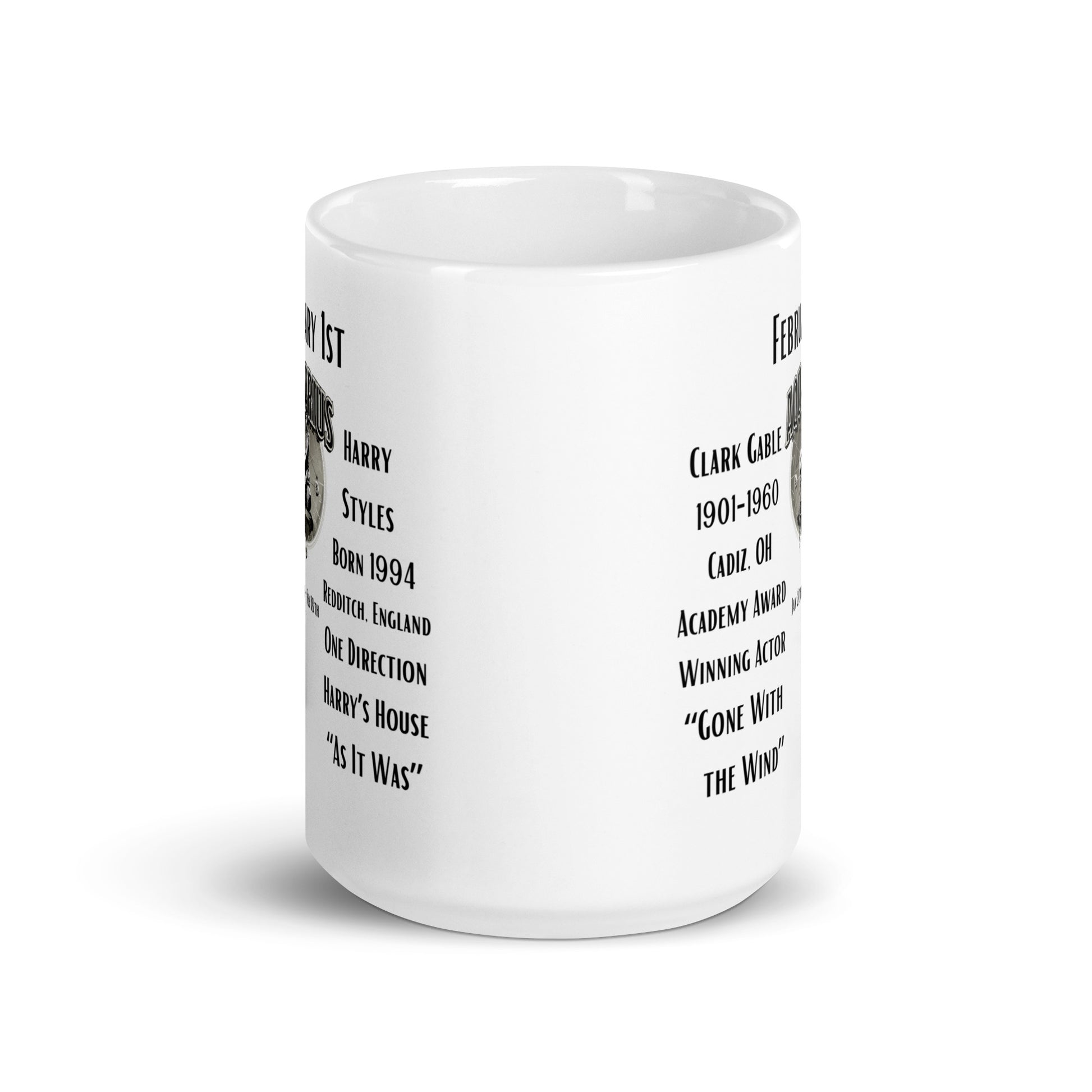 Celebrate February 1st with our "On This Day: Birthday Series" mug, honoring the birth of two iconic figures in entertainment. Clark Gable, born in 1901, captivated audiences with his leading roles in Hollywood's Golden Age, most famously as Rhett Butler in "Gone with the Wind." Sharing this special day, born in 1994, is Harry Styles, the British singer-songwriter who rose to fame with the boy band One Direction and later flourished as a solo artist with hits like "Watermelon Sugar." This mug encapsulates the legacy of two eras in entertainment history.