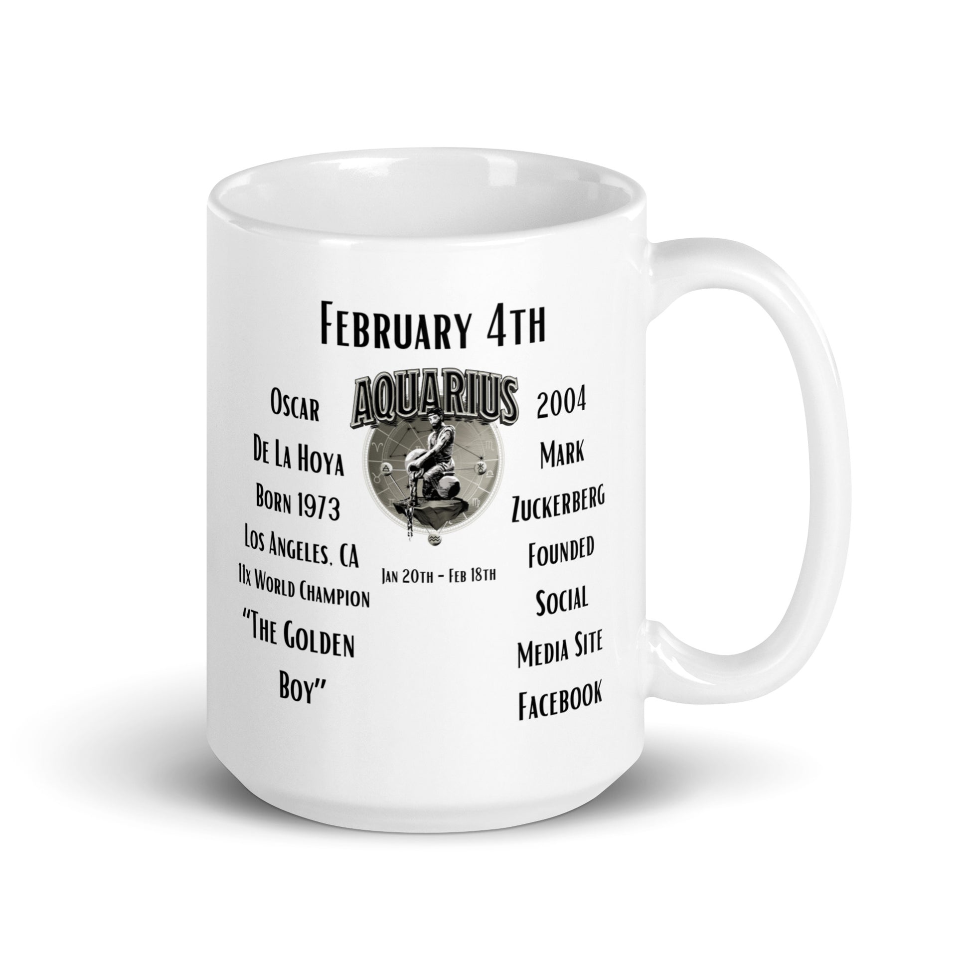 Celebrate the dynamic energy of February 4th with our "On This Day: Birthday Series" mug. On this day, under the innovative sign of Aquarius, we honor the birth of boxing legend Oscar De La Hoya in 1973, known for his speed and precision in the ring. Simultaneously, we mark a milestone in digital history with the founding of Facebook in 2004, a platform that revolutionized social networking and global communication. Each sip from this mug is a toast to athletic prowess and technological breakthrough.