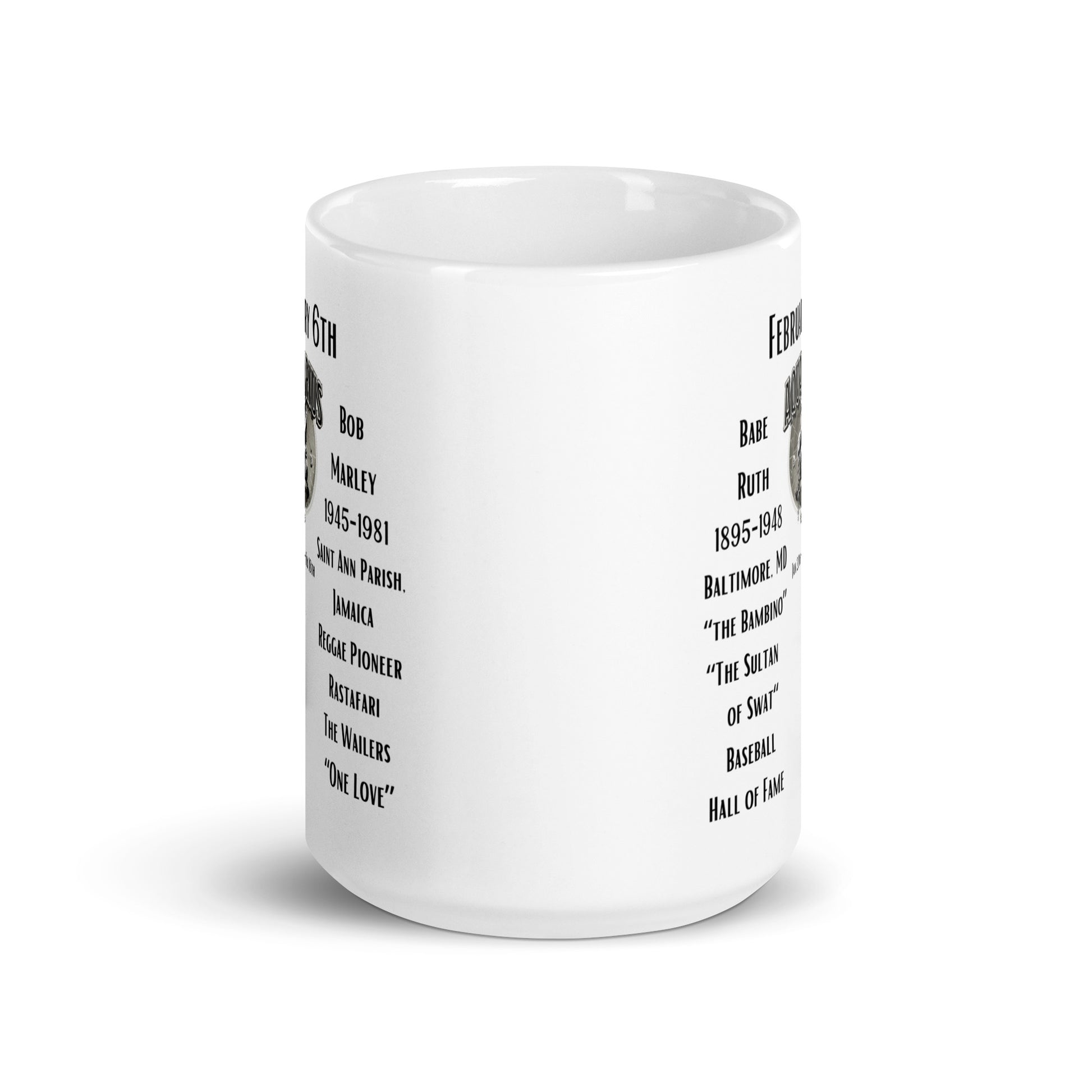 On This Day: Birthday Series - February 06th - (B) Babe Ruth & Bob Marley - White glossy mug