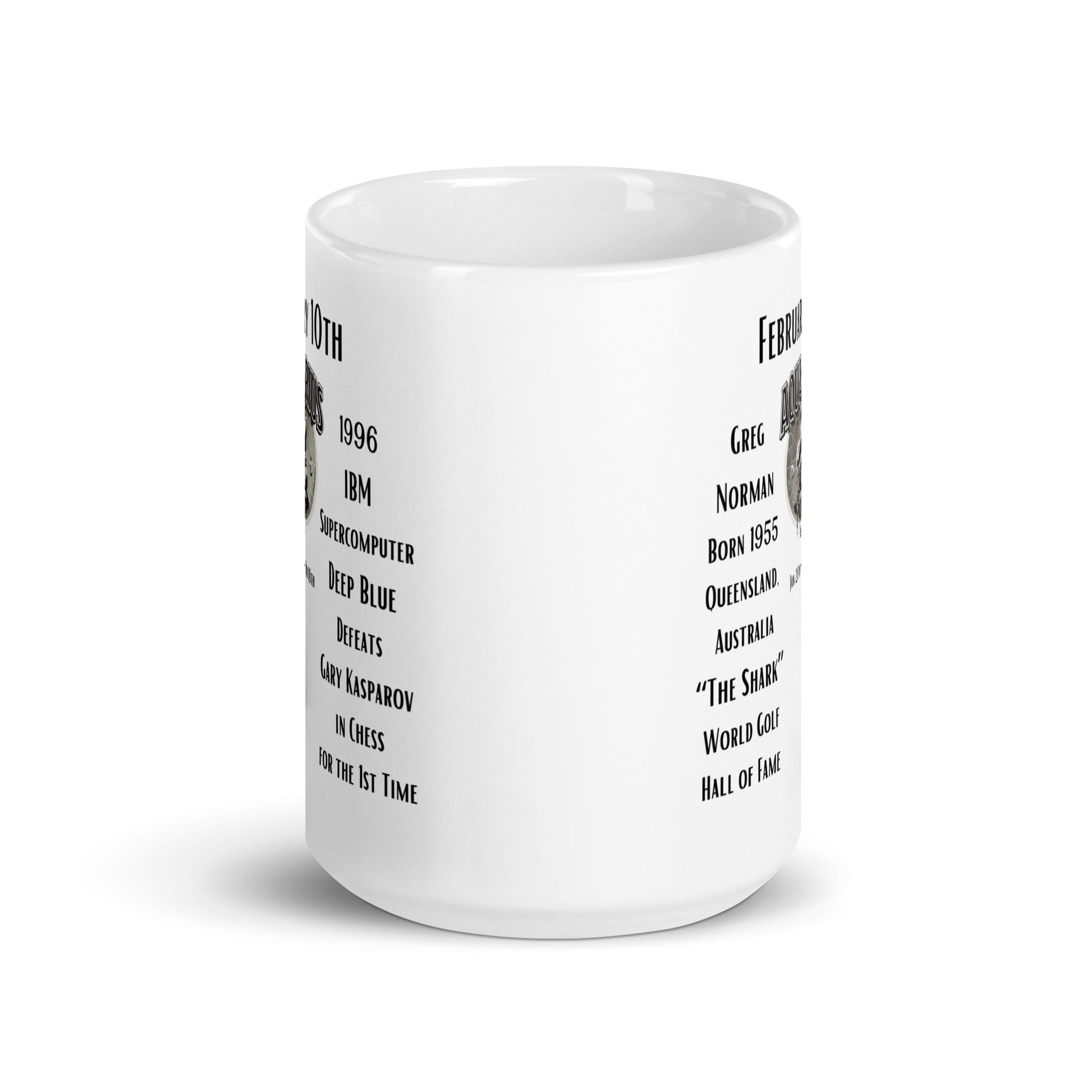 On This Day: Birthday Series - February 10th - (A) Greg Norman & IBM Supercomputer Deep Blue - White glossy mug