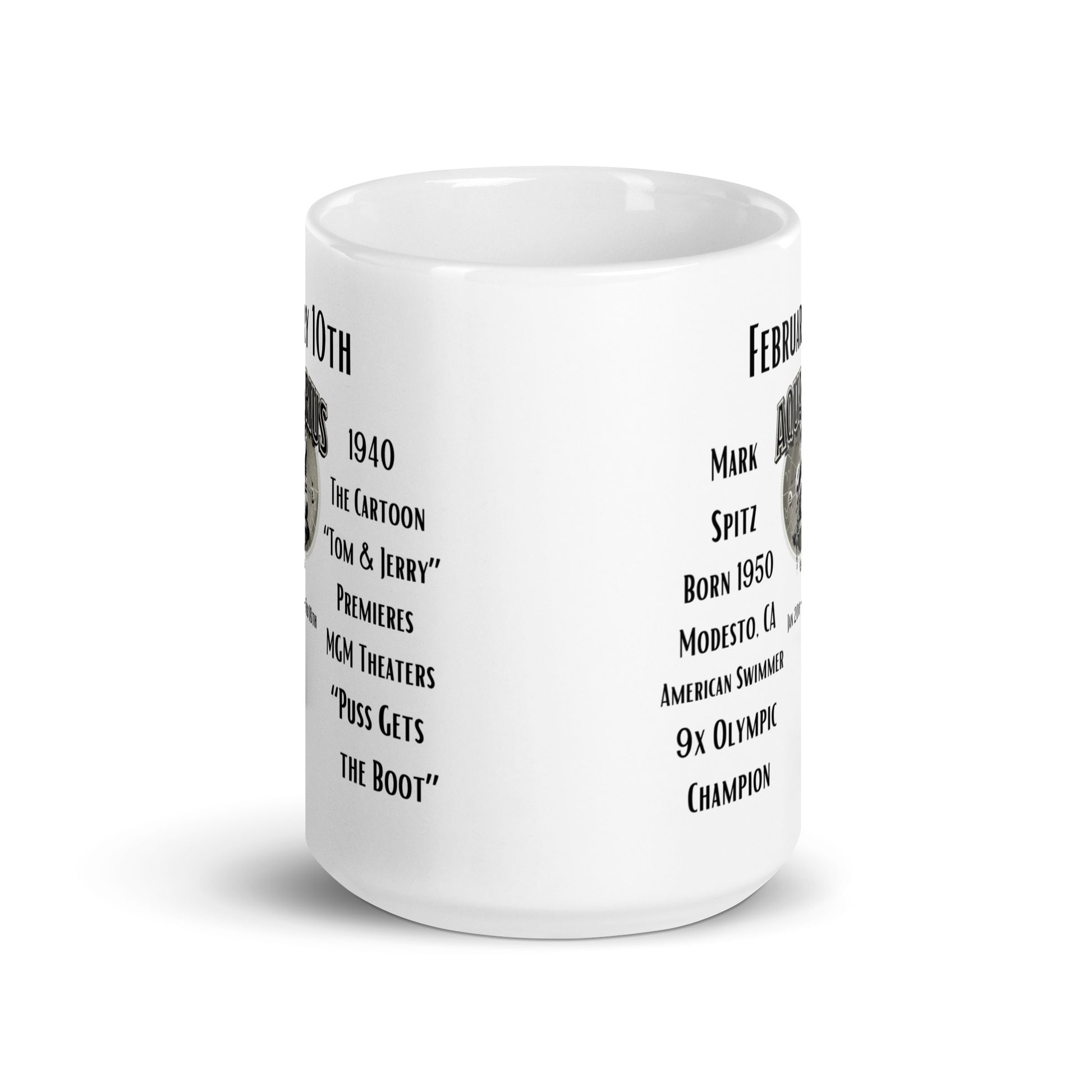 On This Day: Birthday Series - February 10th - (B) Mark Spitz & "Tom & Jerry" Premiers - White glossy mug