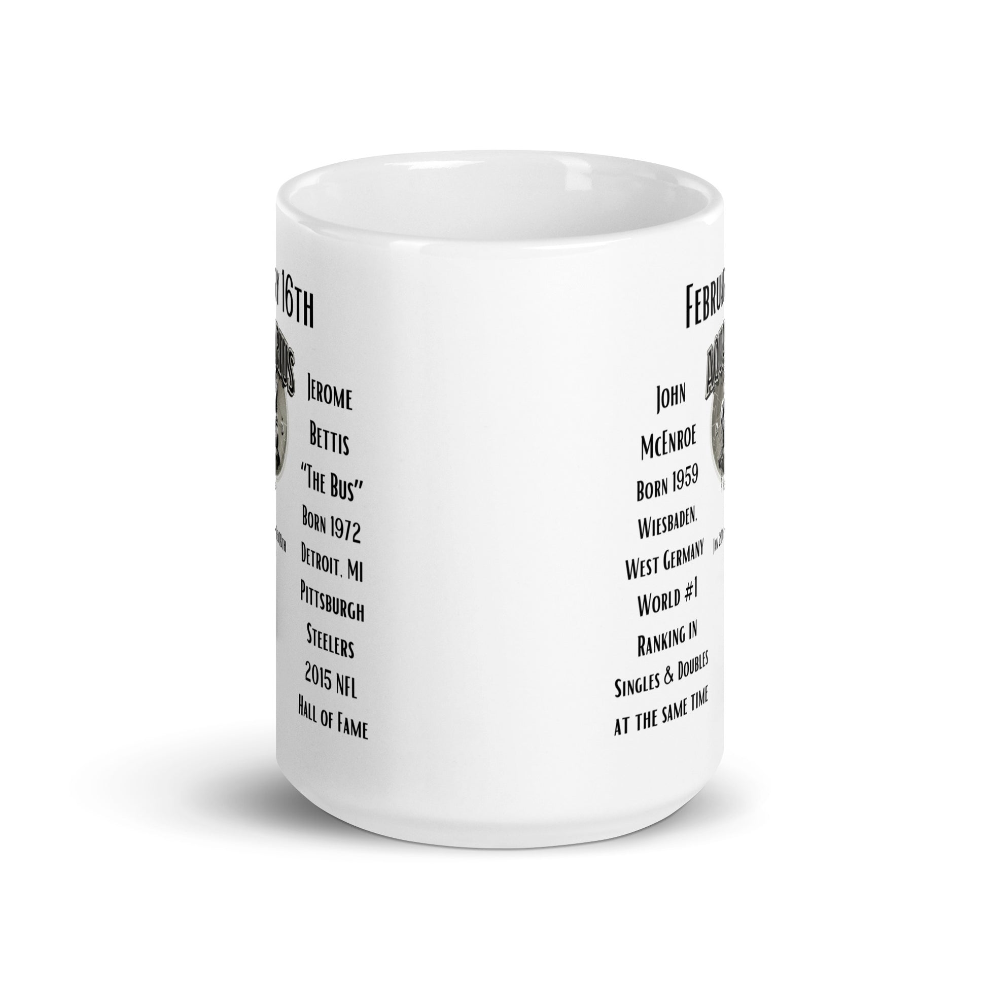 On This Day: Birthday Series - February 16th - (B) John McEnroe & Jerome Bettis - White glossy mug