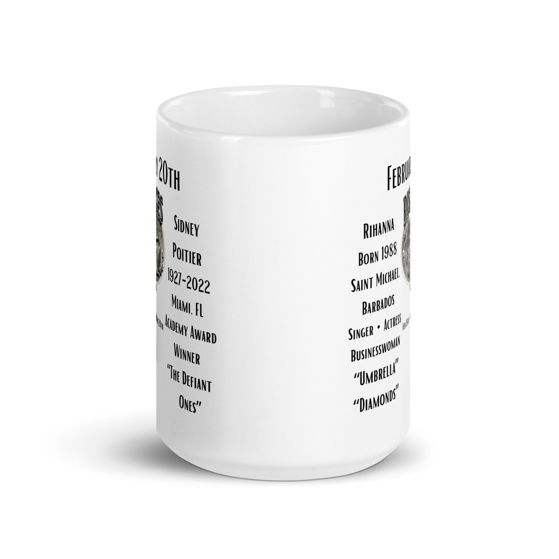On This Day: Birthday Series - February 20th - (B) Rihanna & Sidney Poitier - White glossy mug