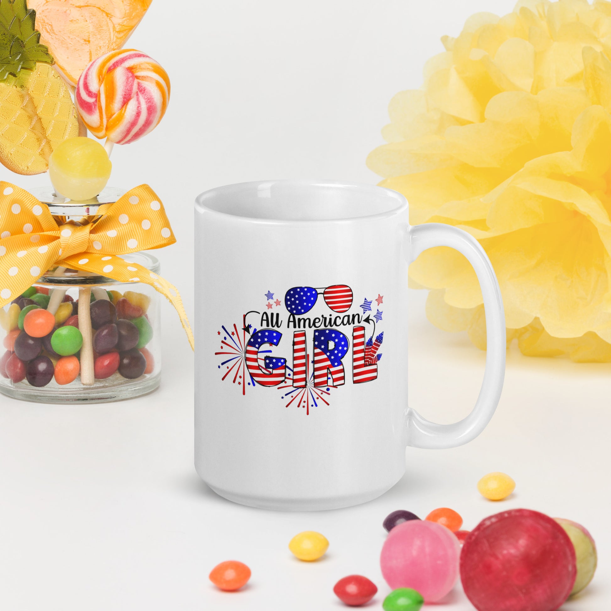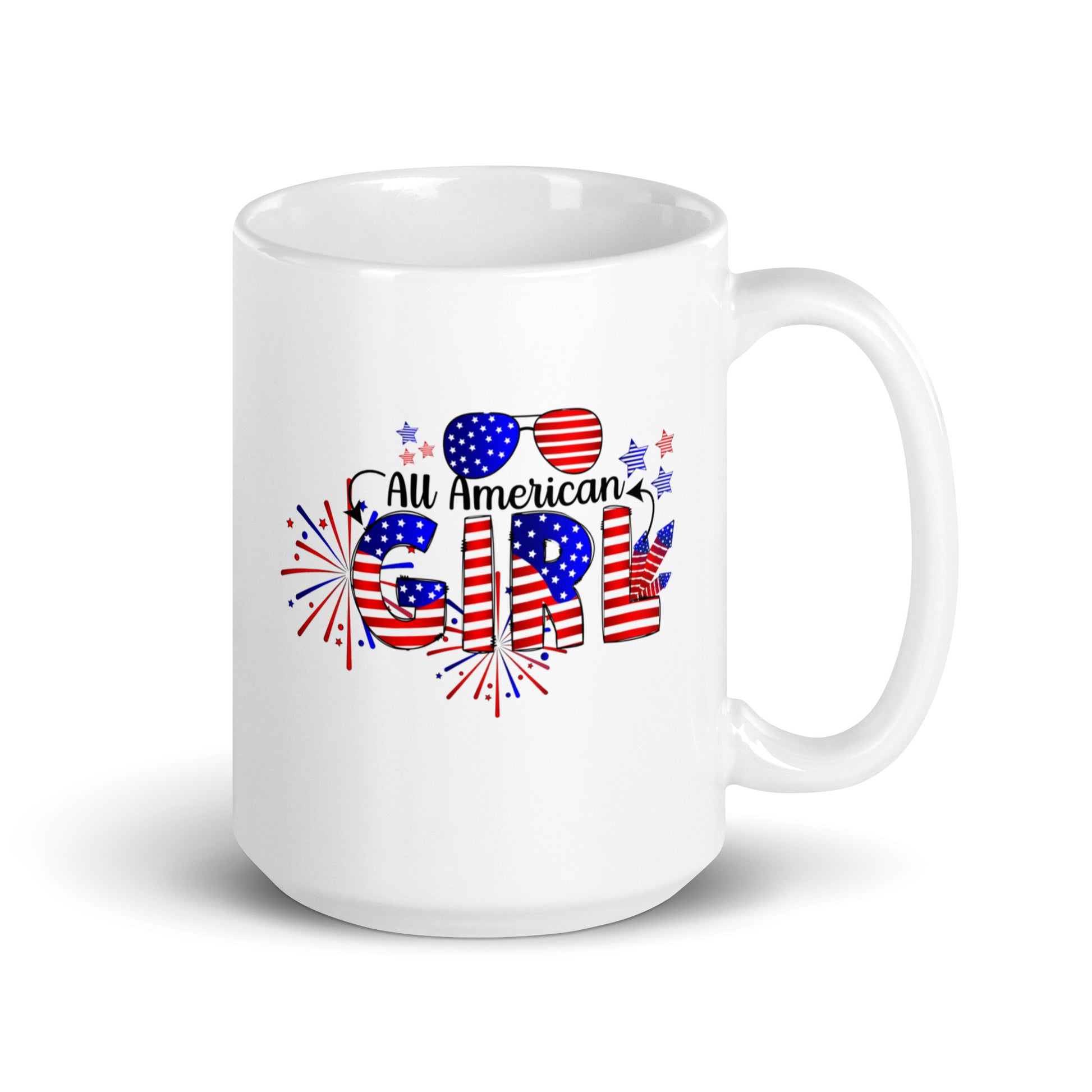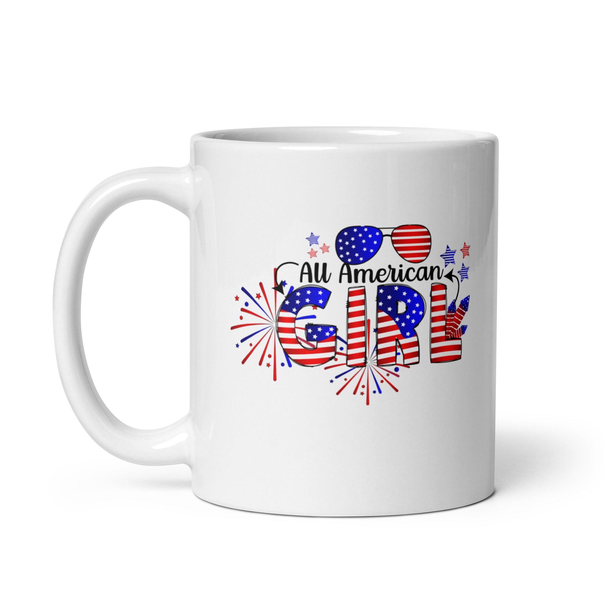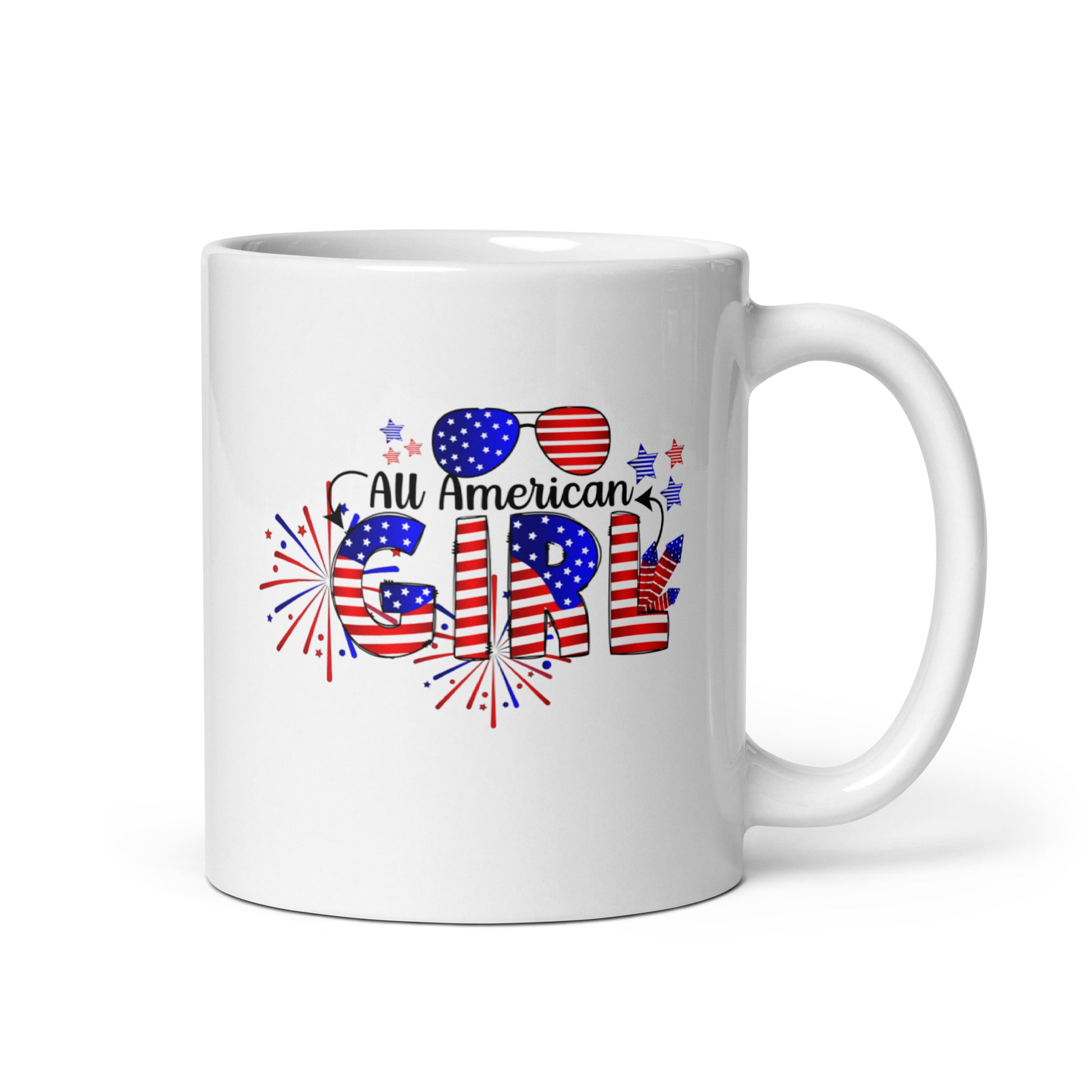 God Bless America, All American Girl, Patriotic, Red White Blue, USA, American Flag, Celebrate your patriotic spirit with our "God Bless America" mug featuring the empowering message "All American GIRL" in bold red, white, and blue. This mug is a tribute to the strength, courage, and independence of every all-American girl. The iconic American flag serves as a backdrop, symbolizing the land of the free and the home of the brave. With its sturdy construction and comfortable handle, this mug is perfect for savoring your favorite hot or cold beverage while embracing your proud American identity. Whether you're enjoying your morning coffee or sharing a heartfelt conversation, let this mug be a daily reminder of the values that define us as a nation. Raise a toast to the spirit of freedom, unity, and girl power with every sip. Show your love for your country and your pride as an all-American girl with this inspiring and stylish mug. It's sturdy and glossy with a vivid print that'll withstand the microwave and dishwasher.