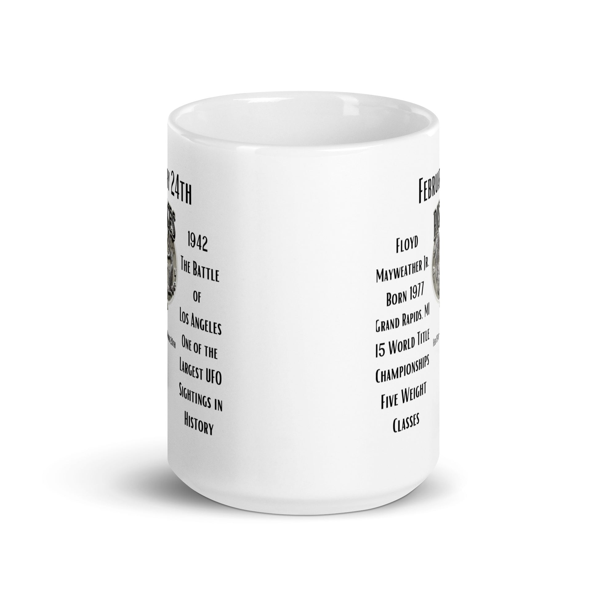 Toast to February 24th with our special "On This Day: Birthday Series" mug. Celebrate the birth of Floyd Mayweather Jr., born in 1977, a name synonymous with boxing excellence and an undefeated career. This day also marks the 1942 event known as The Battle of Los Angeles, an intriguing chapter of World War II history involving a mysterious aerial incident over Los Angeles, sparking theories and discussions that persist to this day. This mug encapsulates the spirit of a champion and a momentous historical event, perfect for starting conversations over your morning coffee.