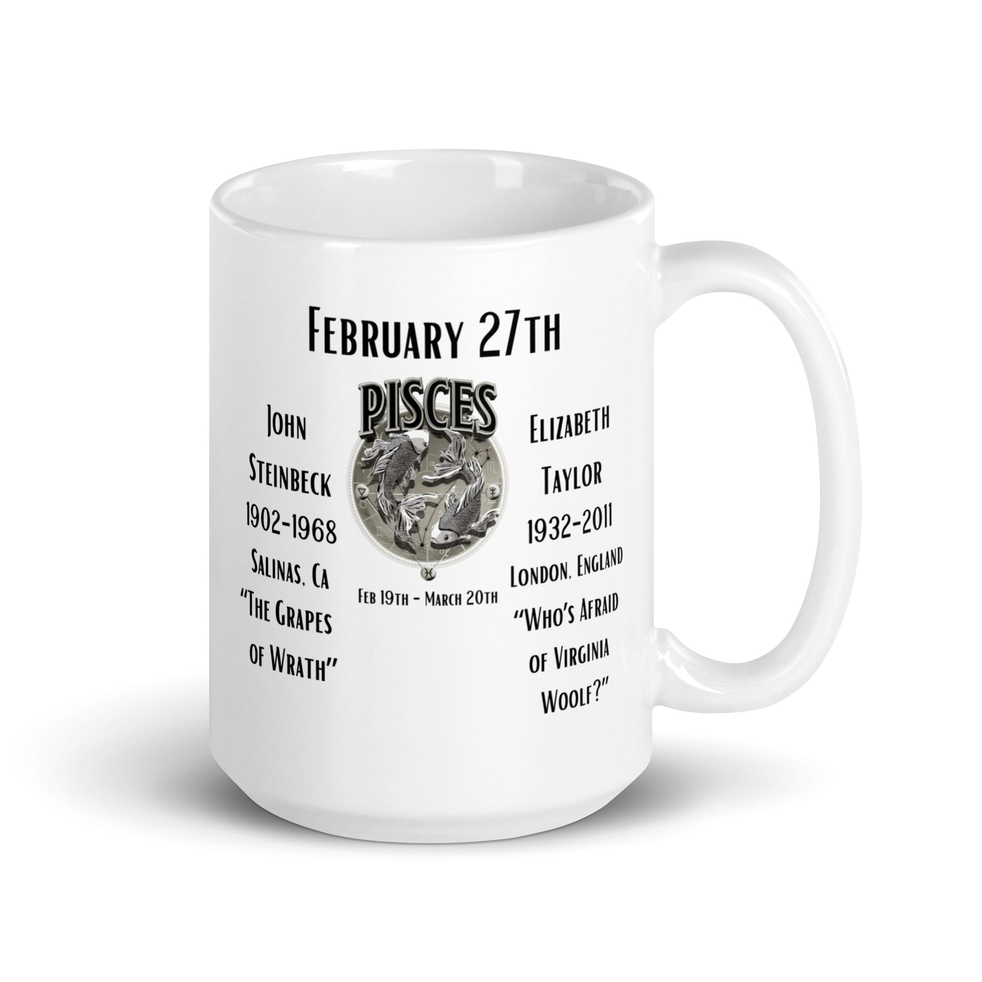 Celebrate a day of extraordinary talent with the "On This Day: Birthday Series" mug, commemorating February 27th. This day marks the birth of two legendary figures: John Steinbeck in 1902, a Nobel laureate whose novels captured the essence of the American spirit, and Elizabeth Taylor in 1932, a cinematic icon known for her captivating beauty and acting prowess. Each sip from this mug is a tribute to their unparalleled contributions to literature and film.