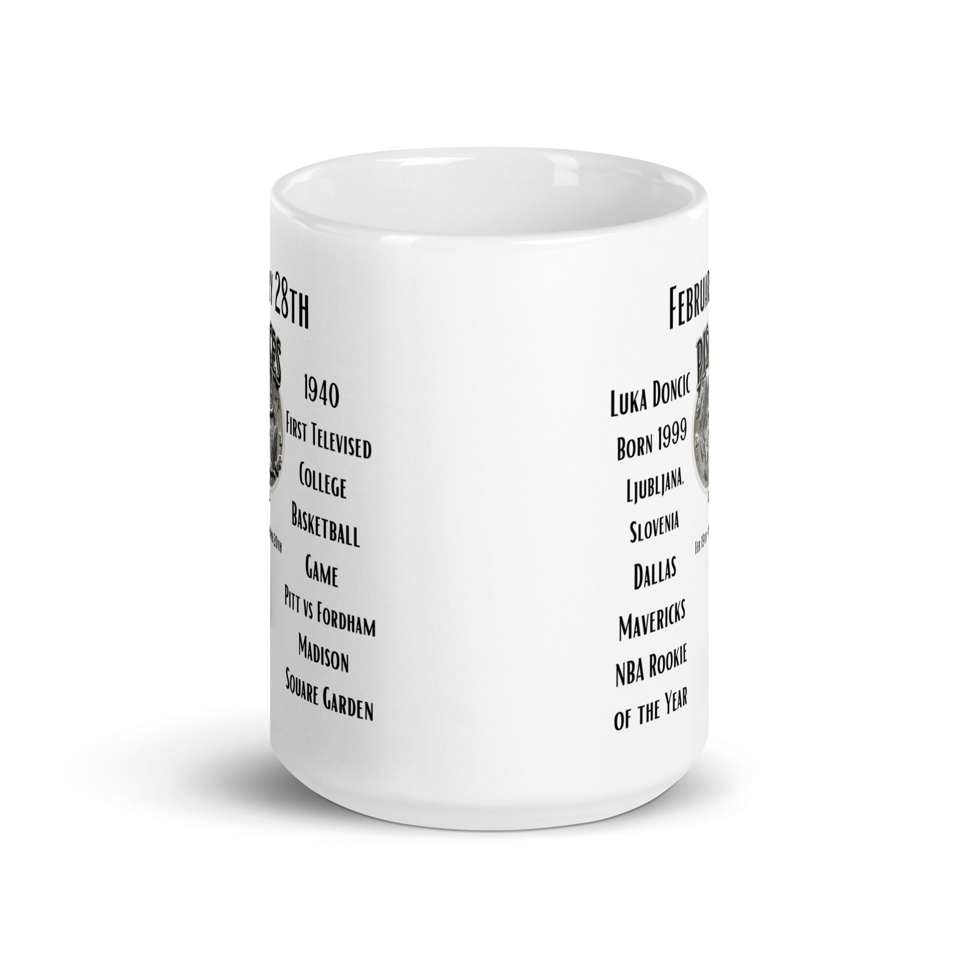 Celebrate February 28th with our "On This Day: Birthday Series" mug, featuring the birth of basketball sensation Luka Dončić in 1999, a rising star known for his incredible skill on the court. This day also commemorates a pivotal moment in sports history – the first televised basketball game in 1940, marking a new era for sports broadcasting. A perfect blend of modern talent and historical milestones, this mug is a slam dunk for basketball fans and history enthusiasts alike.