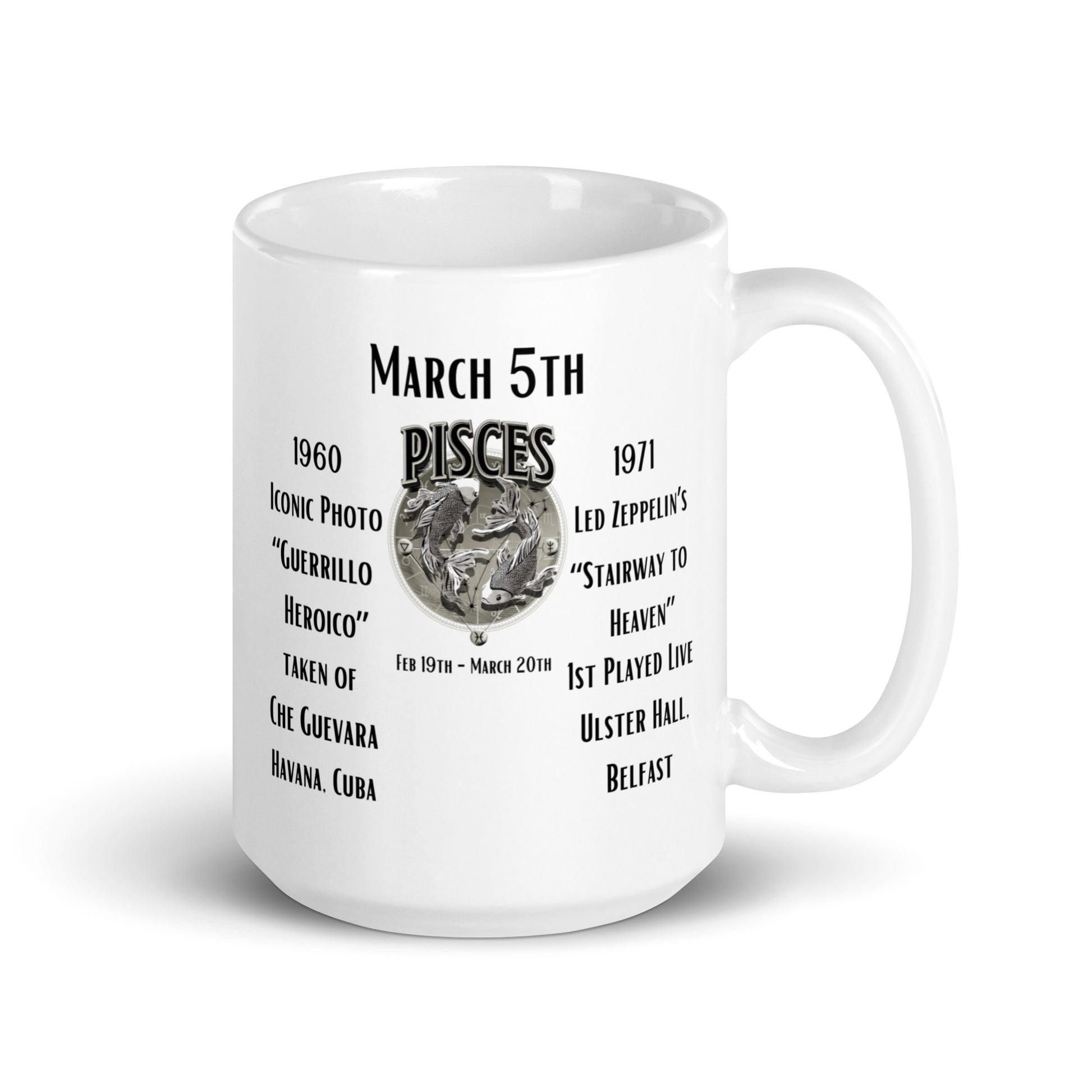 Celebrate the convergence of iconic moments in history with our "On This Day: Birthday Series" mug for March 5th. This day marks the 1960 capture of the "Guerrilla Heroico," the famous photograph of Che Guevara by Alberto Korda, a symbol of rebellion and cultural impact. In addition, it commemorates the first performance of Led Zeppelin's "Stairway to Heaven" at Ulster Hall, Belfast in 1971, a song that became a rock anthem. Savor your beverage while reflecting on these influential moments that shaped art and music.