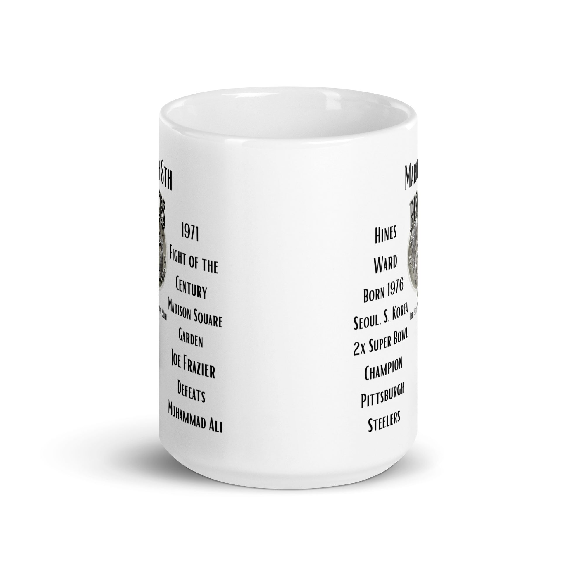 Embrace the spirit of competition and celebration with our "On This Day: Birthday Series" mug for March 8th. Featuring the birthday of NFL star Hines Ward, born in 1976, who made a lasting impact as a wide receiver for the Pittsburgh Steelers and Super Bowl XL MVP. This date is also marked by the historic "Fight of the Century" in 1971, where Muhammad Ali and Joe Frazier faced off in an epic boxing match at Madison Square Garden. Enjoy your favorite beverage while reflecting on these moments of athletic excellence and history-making sports events.