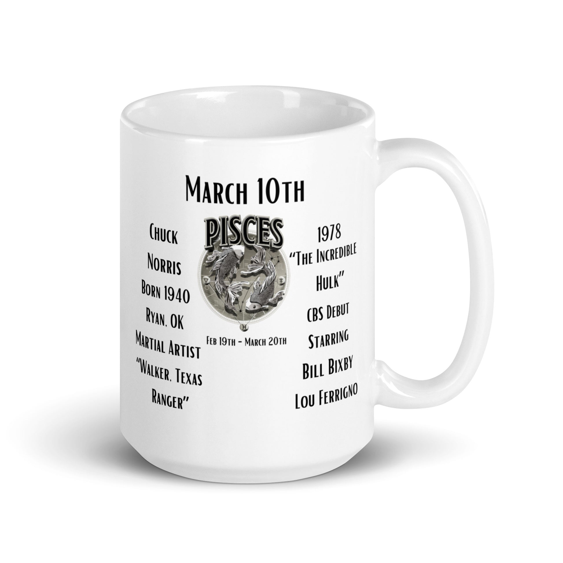 Celebrate action and adventure with the "On This Day: Birthday Series" mug for March 10th. Toast to the birth of the legendary Chuck Norris, a symbol of martial arts and action cinema, born in 1940. Pair this with the debut of "The Incredible Hulk" on CBS in 1978, an iconic television series that brought the beloved Marvel Comics character to life. This mug encapsulates a day that honors the spirit of heroism and enduring pop culture, making every sip a tribute to legends of the screen.