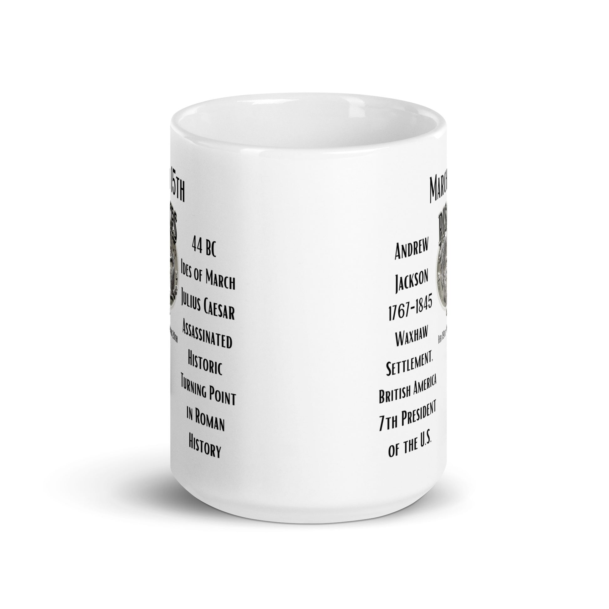 On This Day: Birthday Series - March 15th - (A) Andrew Jackson & Ides of March - White glossy mug