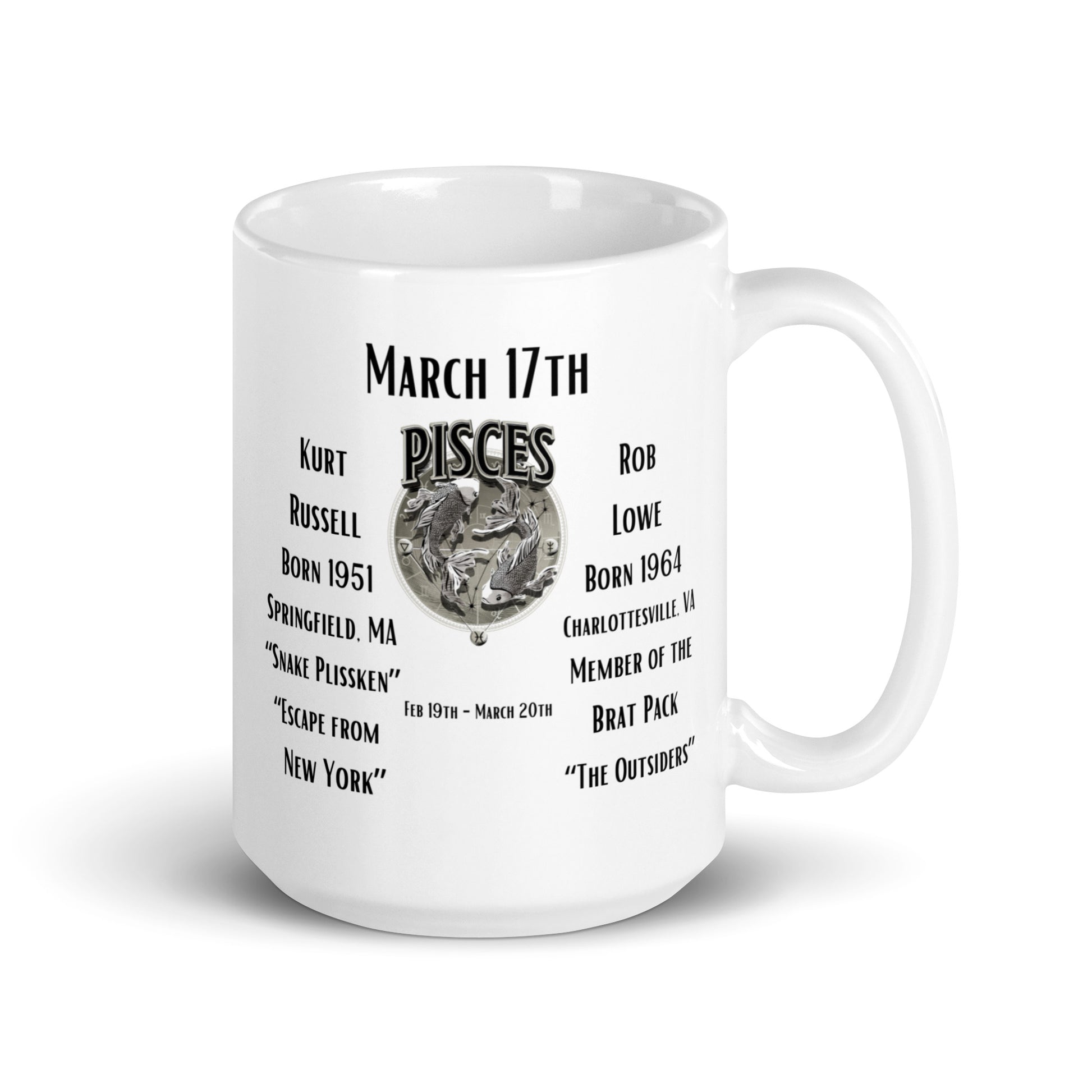 Embrace the luck of the Irish on March 17th with our "On This Day: Birthday Series" mug. Celebrate the birthdays of two charismatic Hollywood stars: Kurt Russell, born in 1951, known for his dynamic roles in films like "Escape from New York," and Rob Lowe, born in 1964, famed for his work in "The West Wing" and "Parks and Recreation." This mug is perfect for movie buffs and pop culture enthusiasts who love to commemorate the achievements of these beloved actors with every sip.