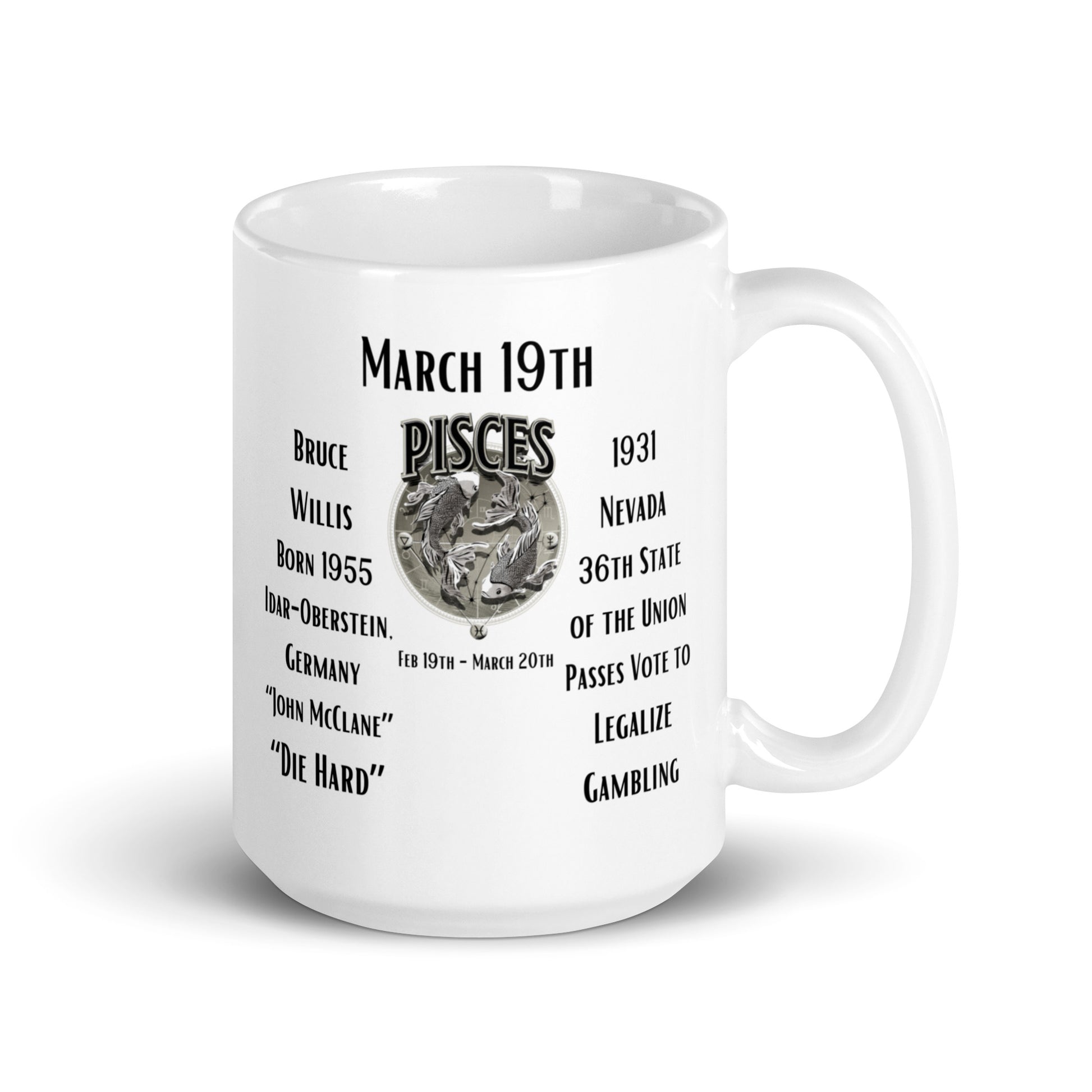 Shuffle the deck for March 19th with our "On This Day: Birthday Series" mug. On this day, the world welcomed the intrepid Bruce Willis, an actor whose roles are etched in the annals of film as emblems of bravery and resilience. Equally momentous, the state of Nevada took a gamble on fortune's favor, legalizing gambling in 1931, and forever changing the face of entertainment in the American West. Born under the dreamy and intuitive sign of Pisces, both Willis and the pioneering spirit of Nevada share a daring for the dramatic and the thrill of the unknown. This mug is a toast to those who take life's risks with confidence, making each bet count.