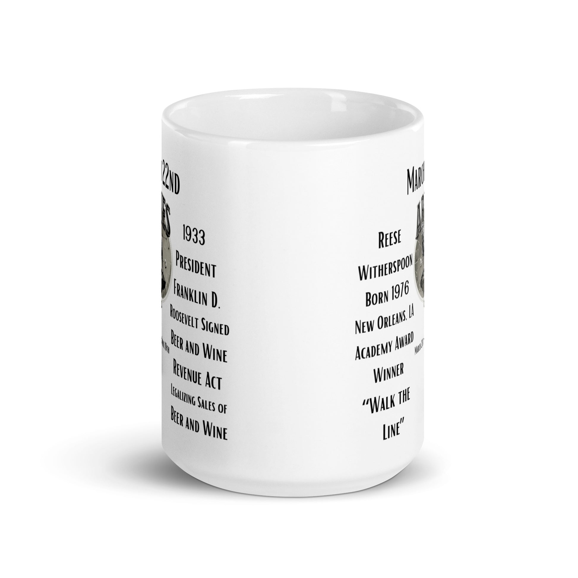 On This Day: Birthday Series - March 22nd - (A) Reese Witherspoon & Beer and Wine Revenue Act - White glossy mug