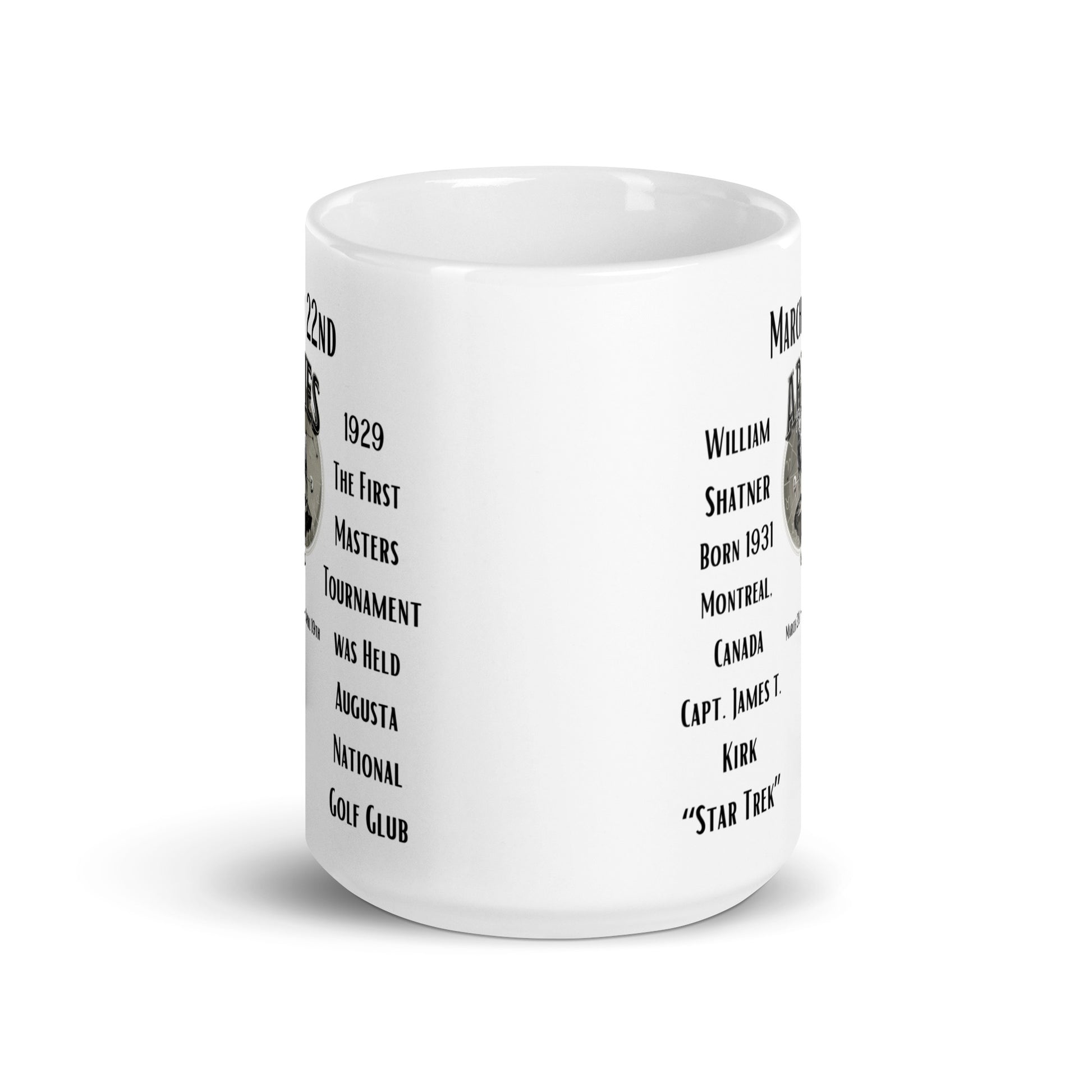 On This Day: Birthday Series - March 22nd - (B) William Shatner & 1st Masters Tournament - White glossy mug