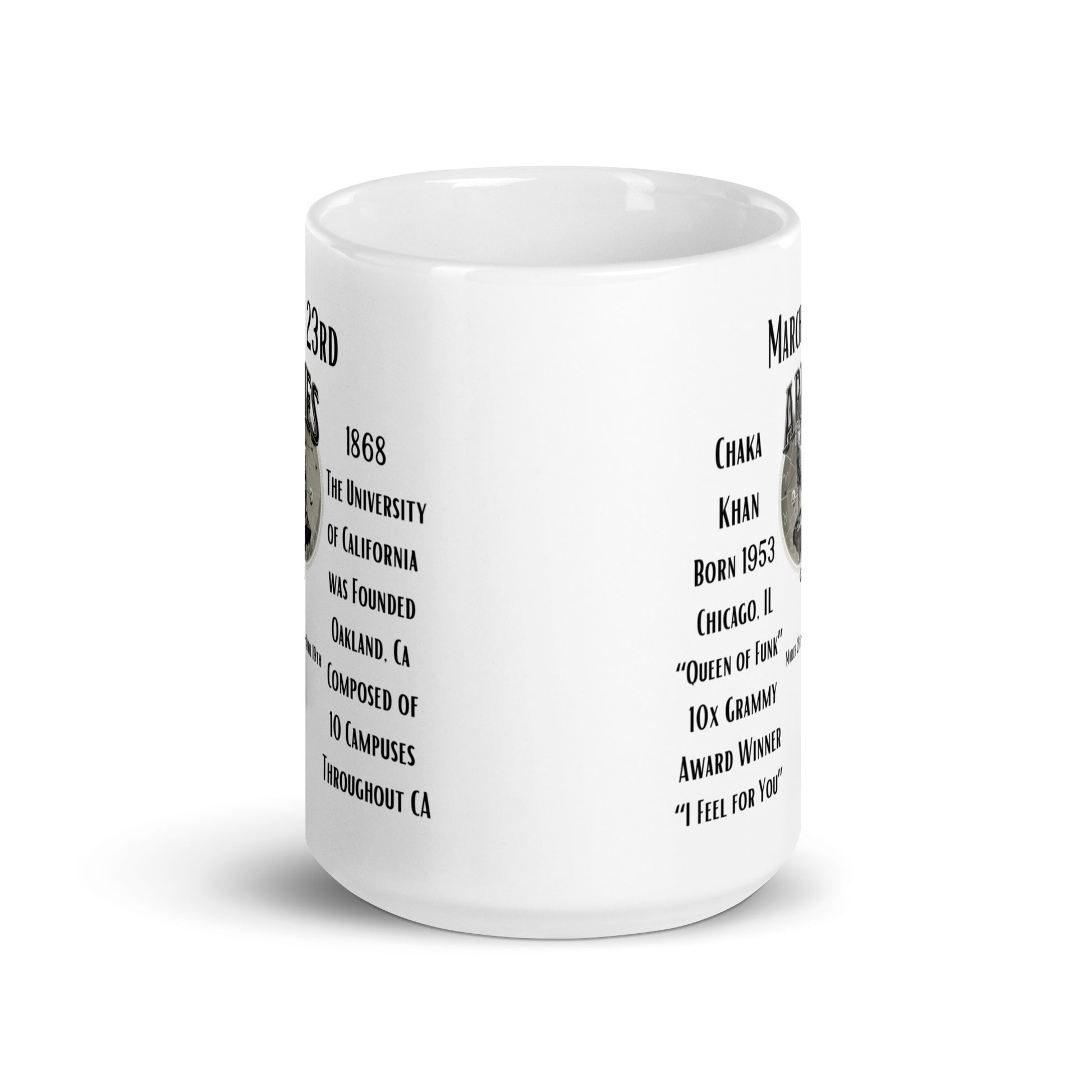 On This Day: Birthday Series - March 23rd - (B) Chaka Khan & The University of California - White glossy mug