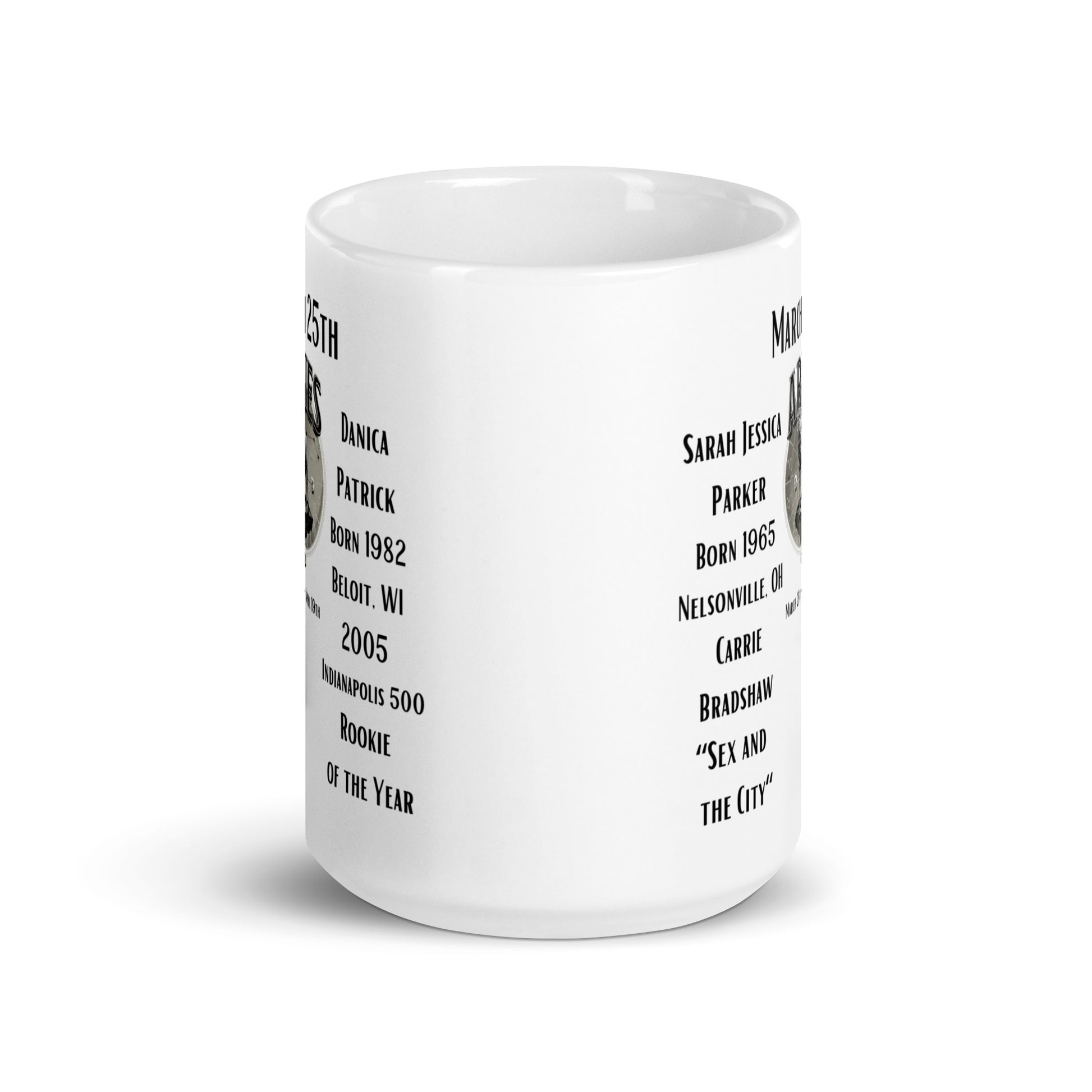On This Day: Birthday Series - March 25th - (B) Sarah Jessica Parker & Danica Patrick - White glossy mug
