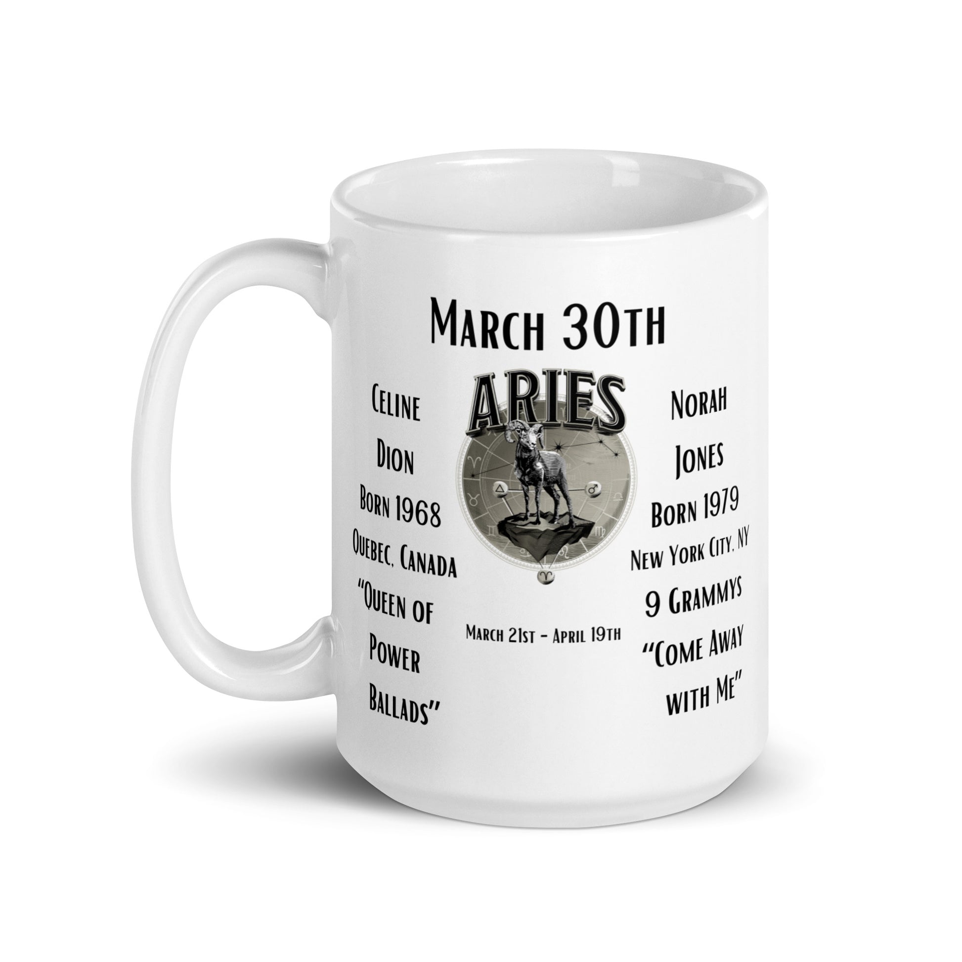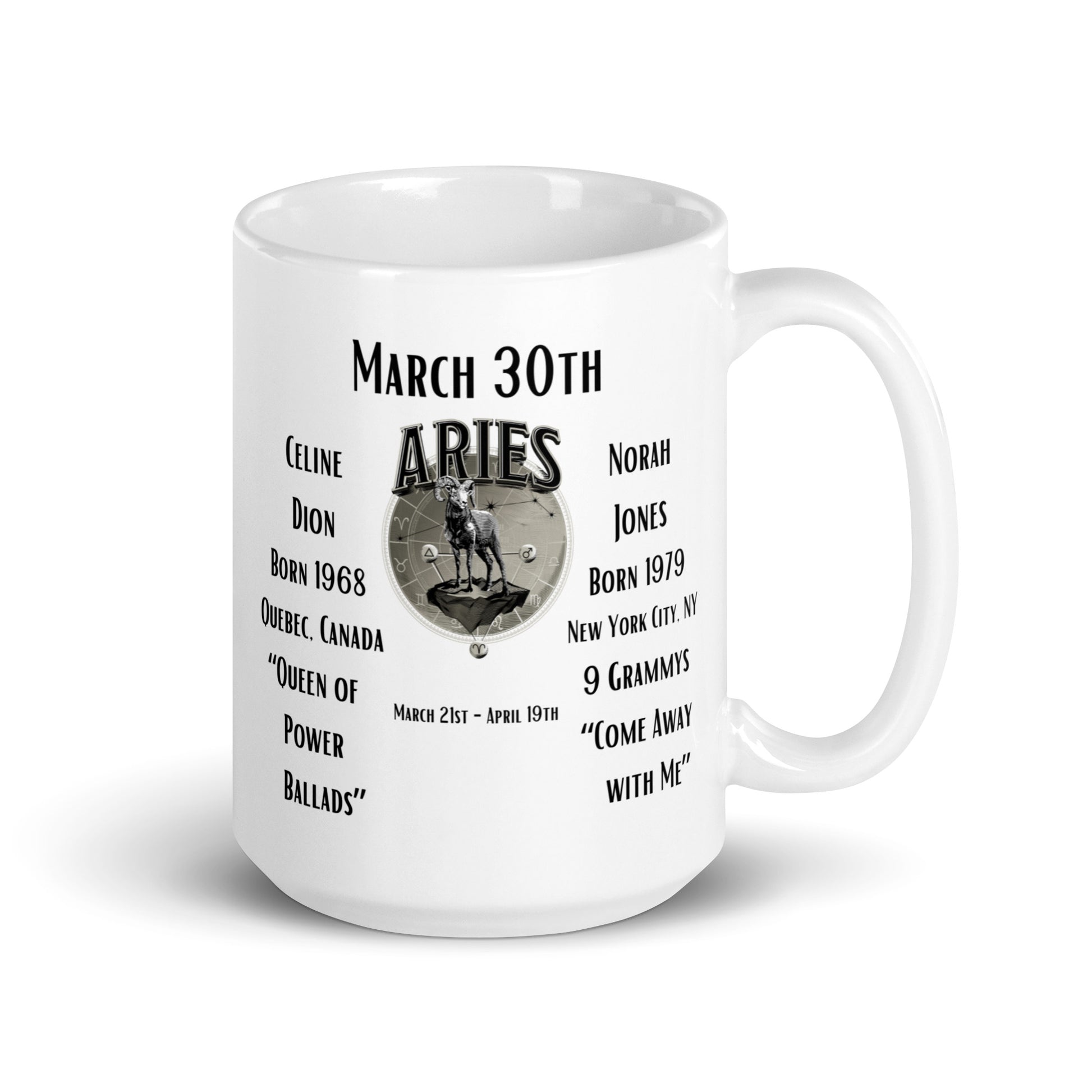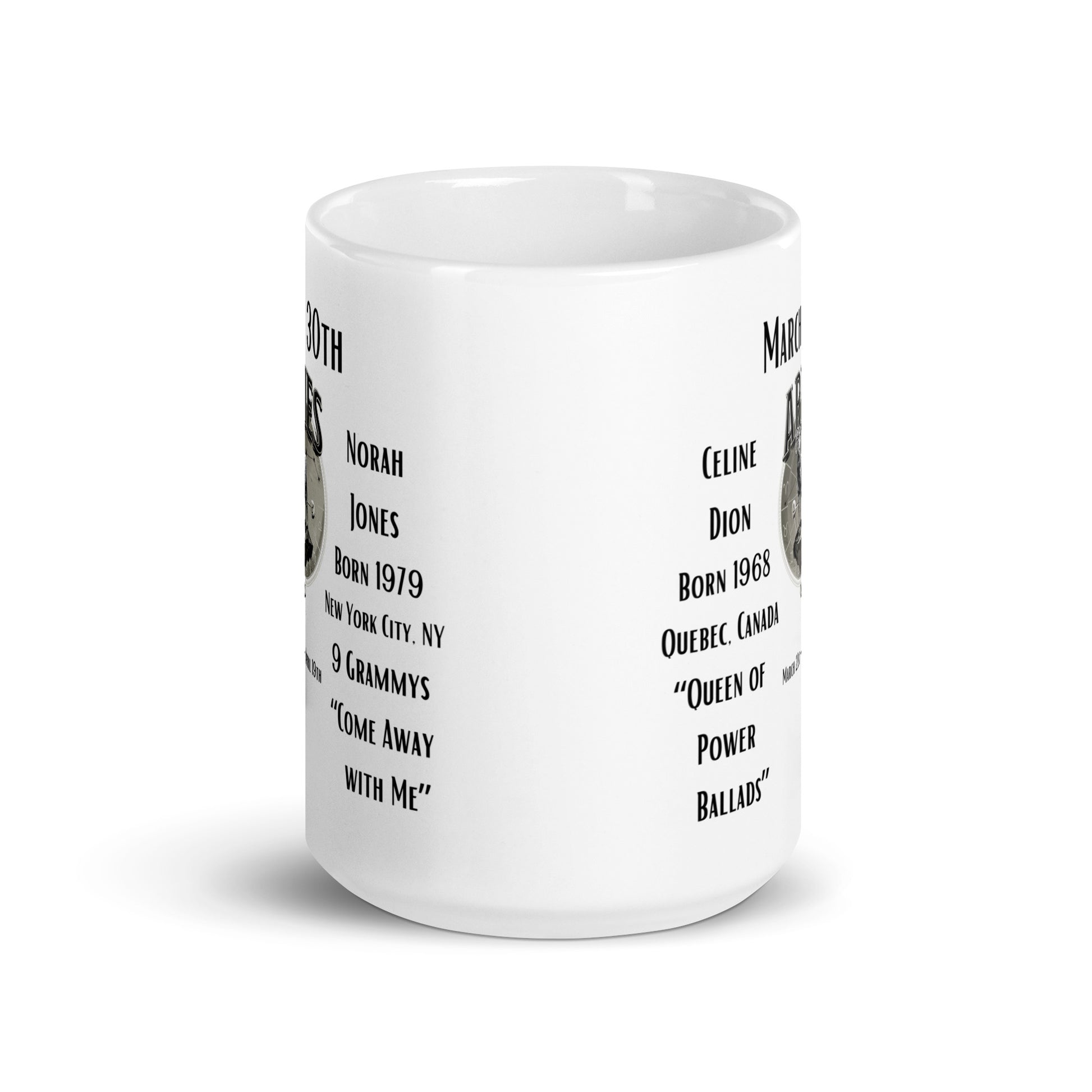 On This Day: Birthday Series - March 30th - (B) Celine Dion & Norah Jones - White glossy mug