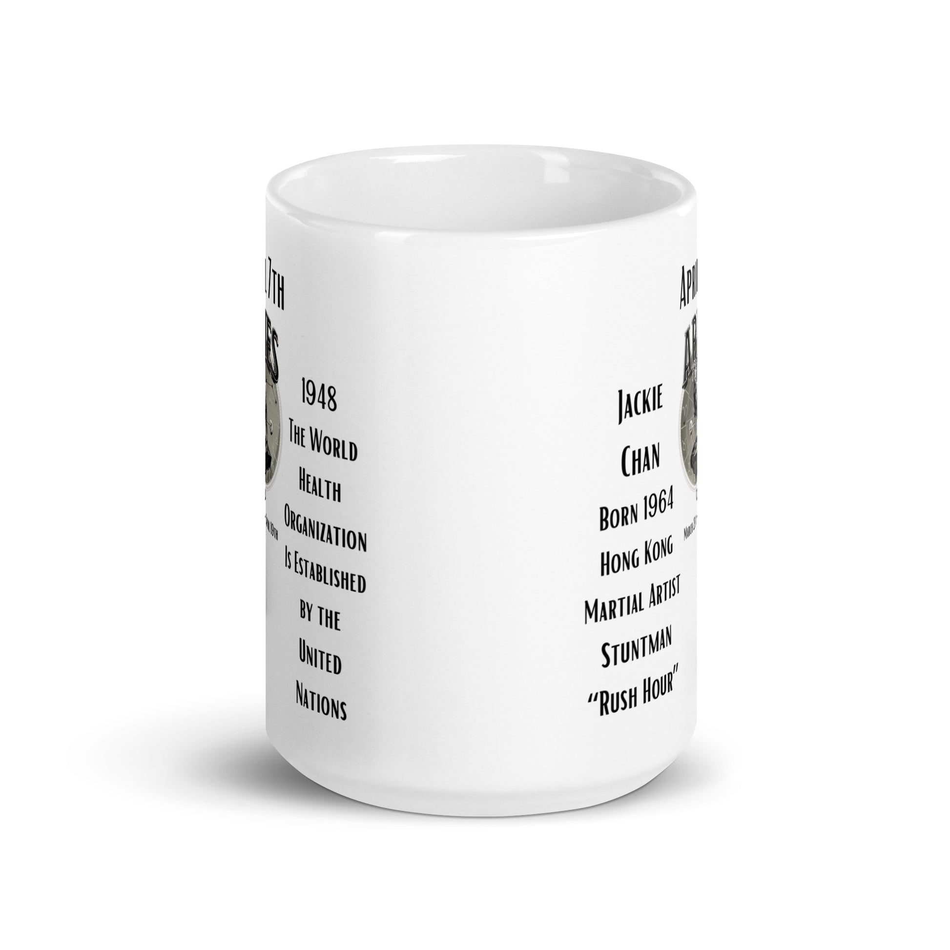 On This Day: Birthday Series - April 07th - (B) Jackie Chan & World Health Organization - White glossy mug