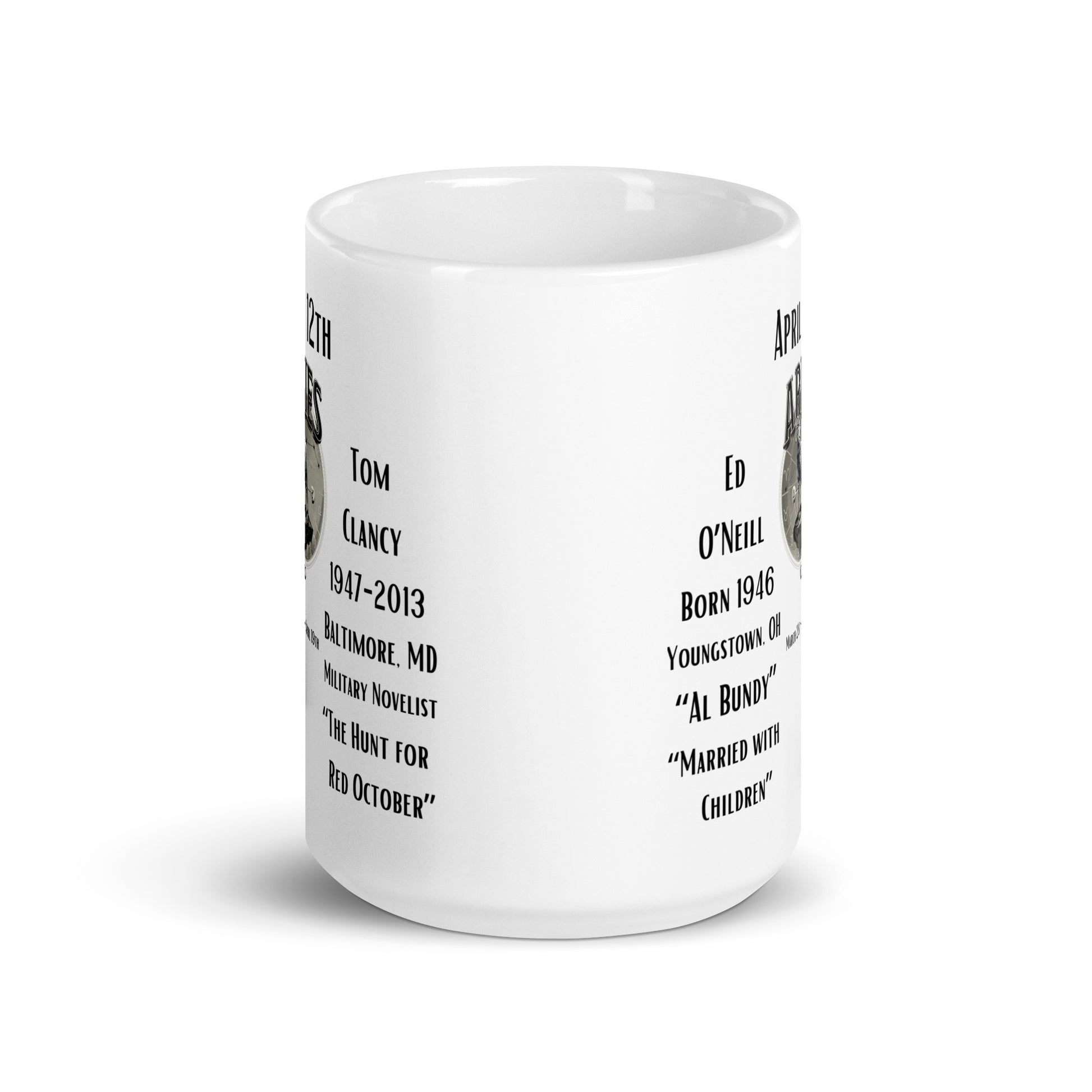 On This Day: Birthday Series - April 12th - (A) Ed O'Neill & Tom Clancy - White glossy mug