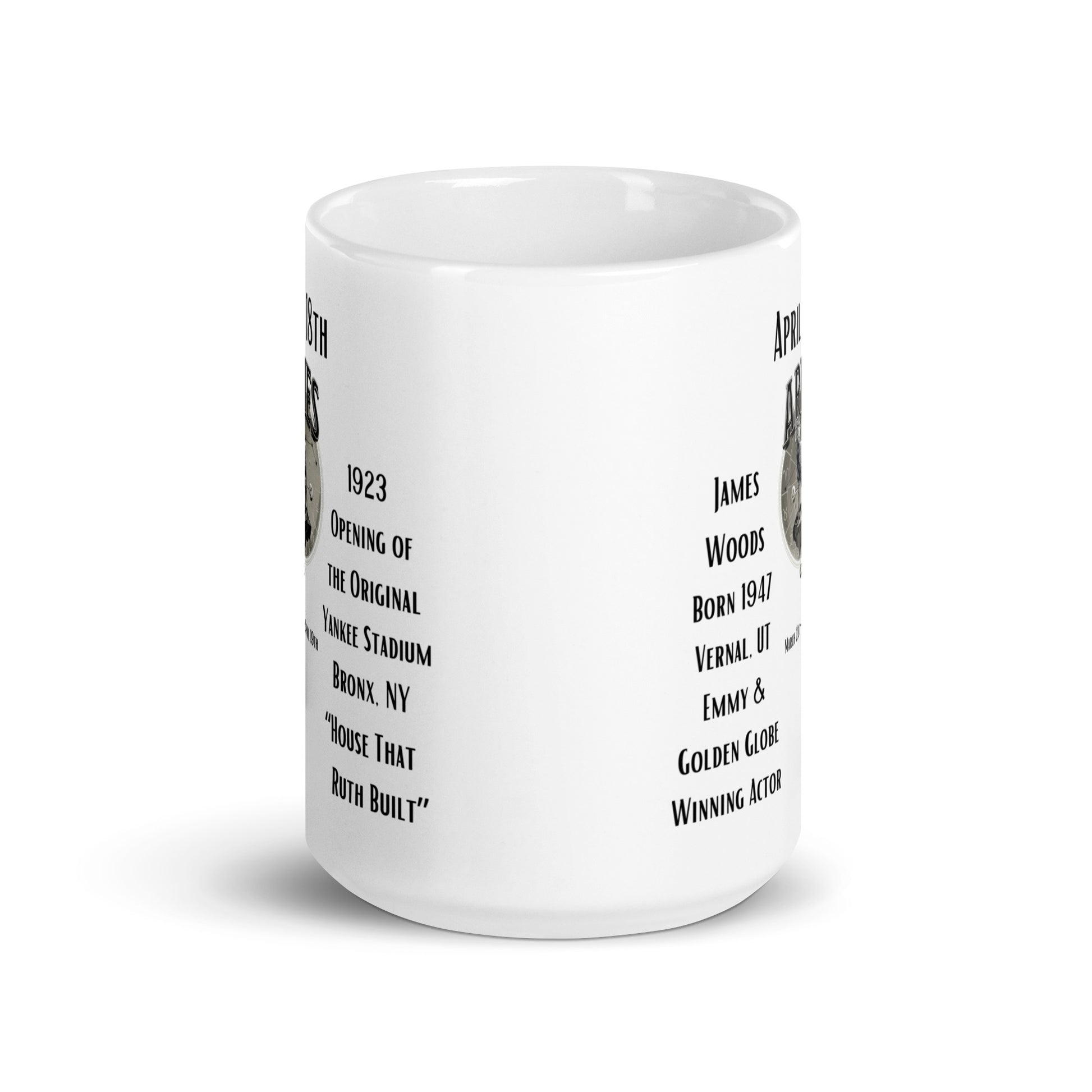 On This Day: Birthday Series - April 18th - (A) James Woods & Yankee Stadium - White glossy mug