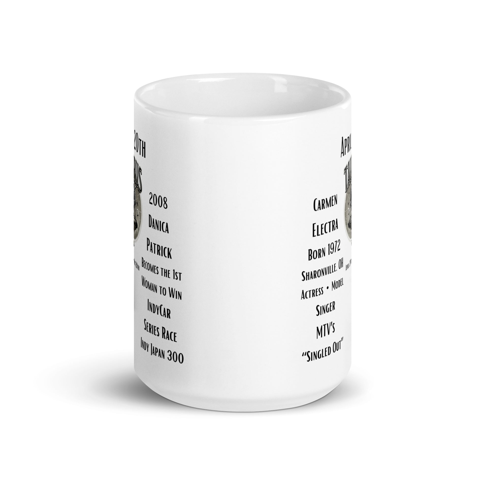 April 20th marks the birthdays of influential women who have made their mark in entertainment and sports. Born on this day in 1972, Carmen Electra, an American actress, model, and singer, rose to fame with her charismatic presence in television and film, becoming a symbol of glamour and versatility. This day also commemorates a milestone in sports history: in 2008, Danica Patrick became the first woman to win an IndyCar Series race, securing victory at the Indy Japan 300. Her achievement shattered barriers and set new standards in a male-dominated sport. This mug is a tribute to the spirit of innovation and the power of breaking new ground, whether on the screen or the racetrack.