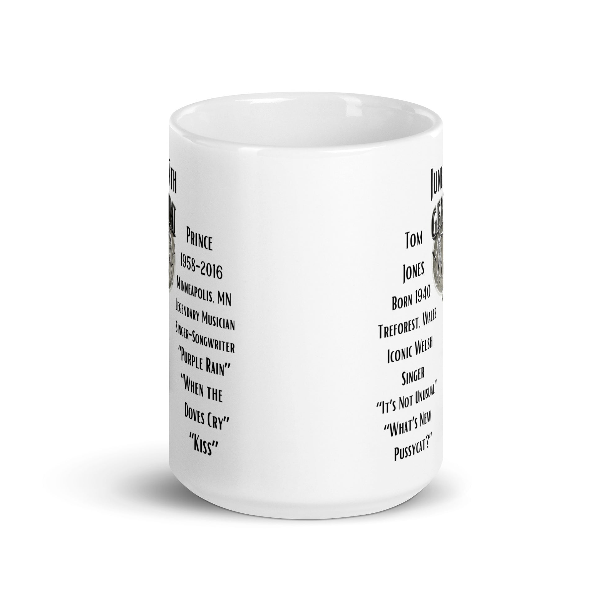 On This Day: Birthday Series - June 07th - (A) Tom Jones & Prince - White glossy mug