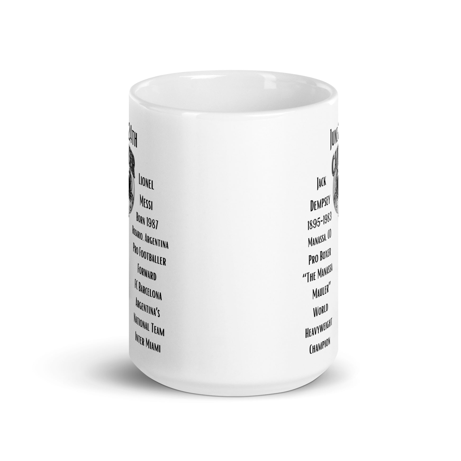On This Day: Birthday Series - June 24th - (A) Jack Dempsey & Lionel Messi - White glossy mug