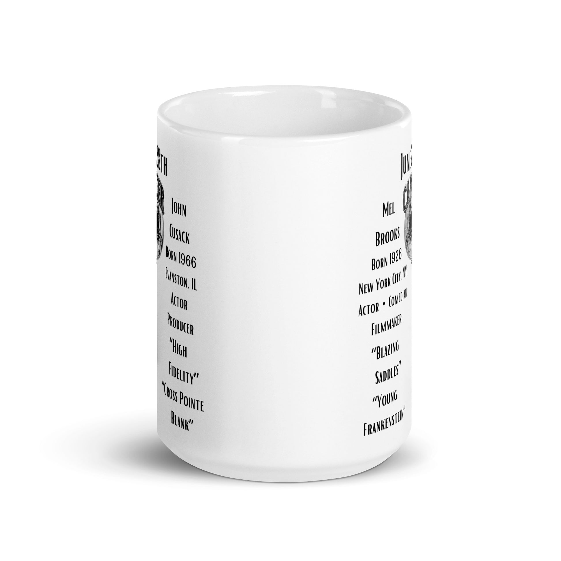 On This Day: Birthday Series - June 28th - Mel Brooks & John Cusack - White glossy mug