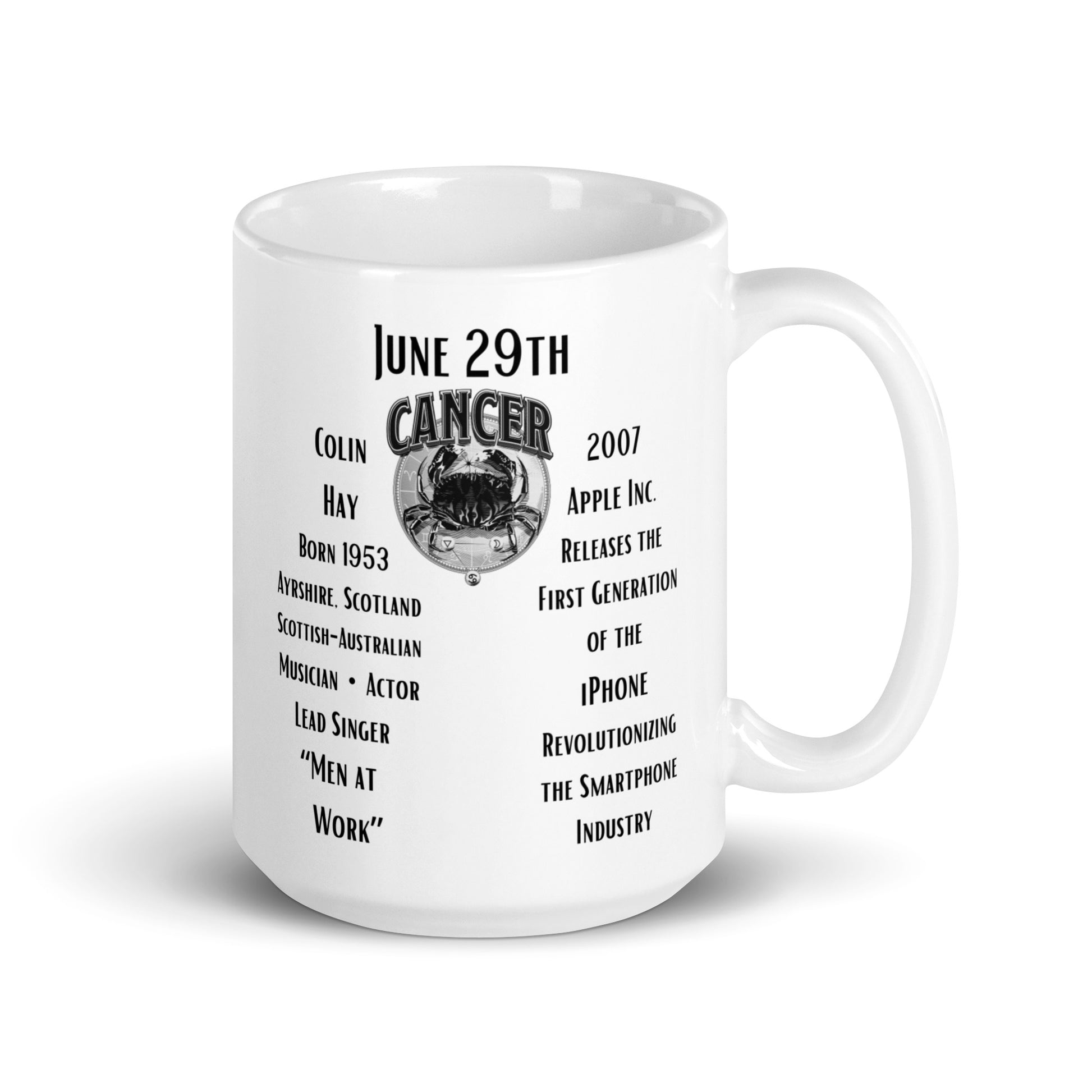 On This Day: Birthday Series - June 29th - (B) Colin Hay & Apple Releases 1st iPhone - White glossy mug