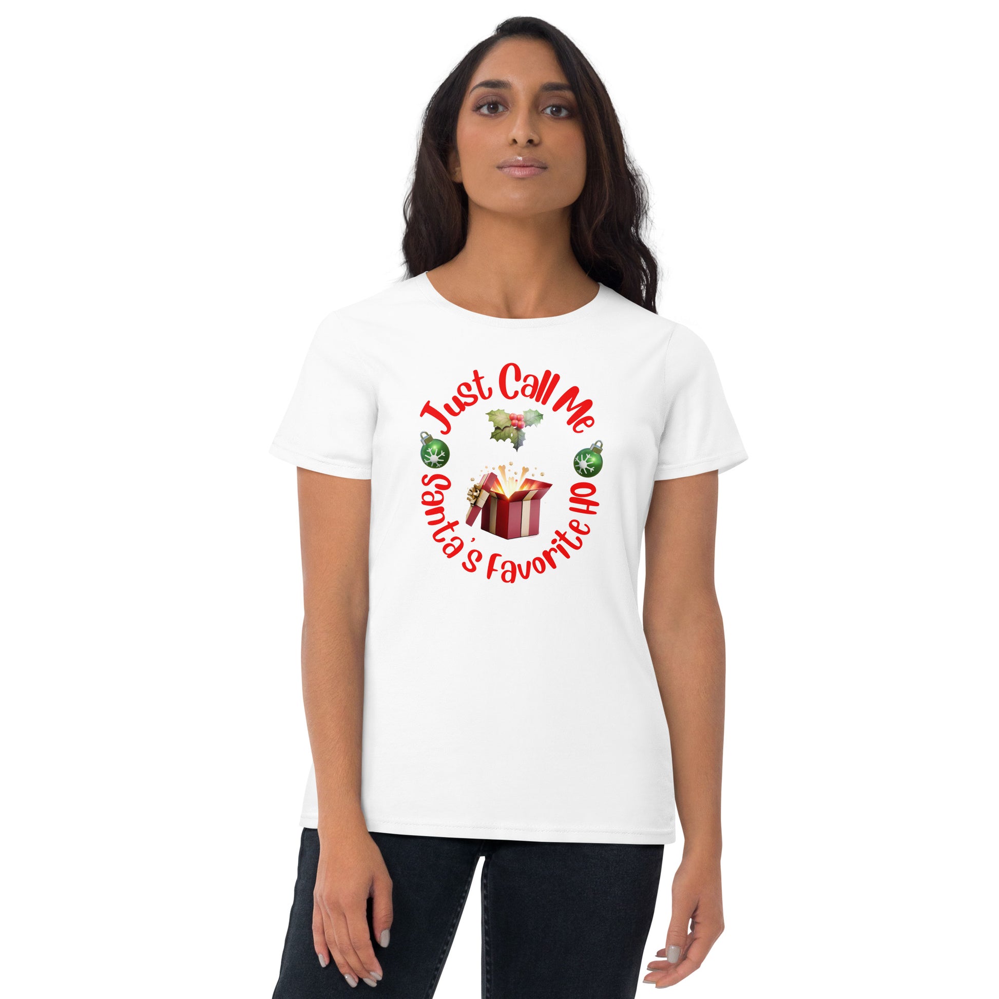 Get ready to spread some laughter and festive cheer with our "Just Call Me Santa's Favorite HO" women's short sleeve T-shirt. This hilarious and cheeky shirt features a bold design with an image of mistletoe and presents, accompanied by the witty text that is sure to turn heads and ignite laughter wherever you go. Made from premium-quality materials, this T-shirt offers both comfort and style. Its soft and breathable fabric ensures a comfortable fit, while the flattering cut adds a touch of femininity. Whether you're attending a holiday gathering or simply want to add a touch of humor to your wardrobe, this T-shirt is the perfect choice. Grab one for yourself or gift it to a friend who appreciates a good laugh. Embrace the fun and lightheartedness of our Rude, Crude, and Funny T-shirt collection and make a bold statement this Christmas season.